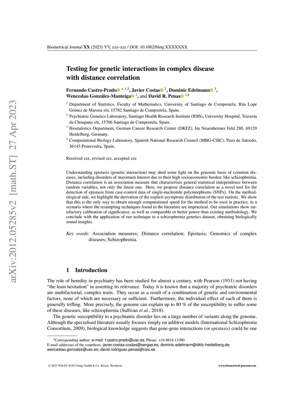 Understanding epistasis (genetic interaction) may shed some light on the genomic basis of common diseases, including disorders of maximum interest due to their high socioeconomic burden, like schizophrenia. Distance correlation is an association measure that characterises general statistical independence between random variables, not only the linear one. Here, we propose distance correlation as a novel tool for the detection of epistasis from case-control data of single nucleotide polymorphisms (SNPs). This approach will be developed both theoretically (mathematical statistics, in a context of high-dimensional statistical inference) and from an applied point of view (simulations and real datasets).