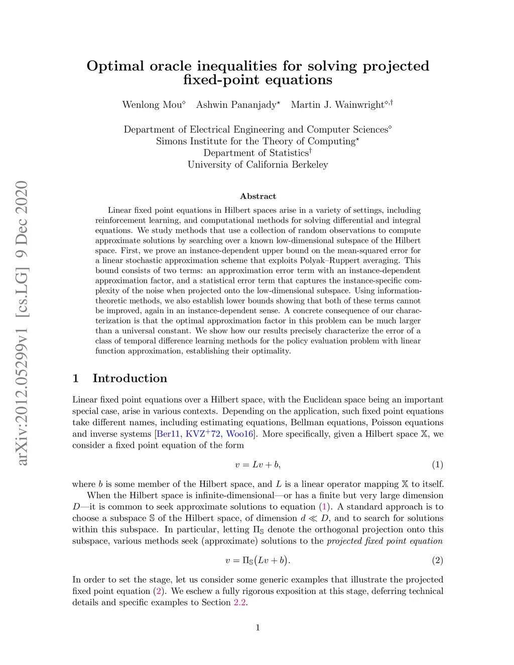 Linear fixed point equations in Hilbert spaces arise in a variety of settings, including reinforcement learning, and computational methods for solving differential and integral equations. We study methods that use a collection of random observations to compute approximate solutions by searching over a known low-dimensional subspace of the Hilbert space. First, we prove an instance-dependent upper bound on the mean-squared error for a linear stochastic approximation scheme that exploits Polyak--Ruppert averaging. This bound consists of two terms: an approximation error term with an instance-dependent approximation factor, and a statistical error term that captures the instance-specific complexity of the noise when projected onto the low-dimensional subspace. Using information theoretic methods, we also establish lower bounds showing that both of these terms cannot be improved, again in an instance-dependent sense. A concrete consequence of our characterization is that the optimal approximation factor in this problem can be much larger than a universal constant. We show how our results precisely characterize the error of a class of temporal difference learning methods for the policy evaluation problem with linear function approximation, establishing their optimality.