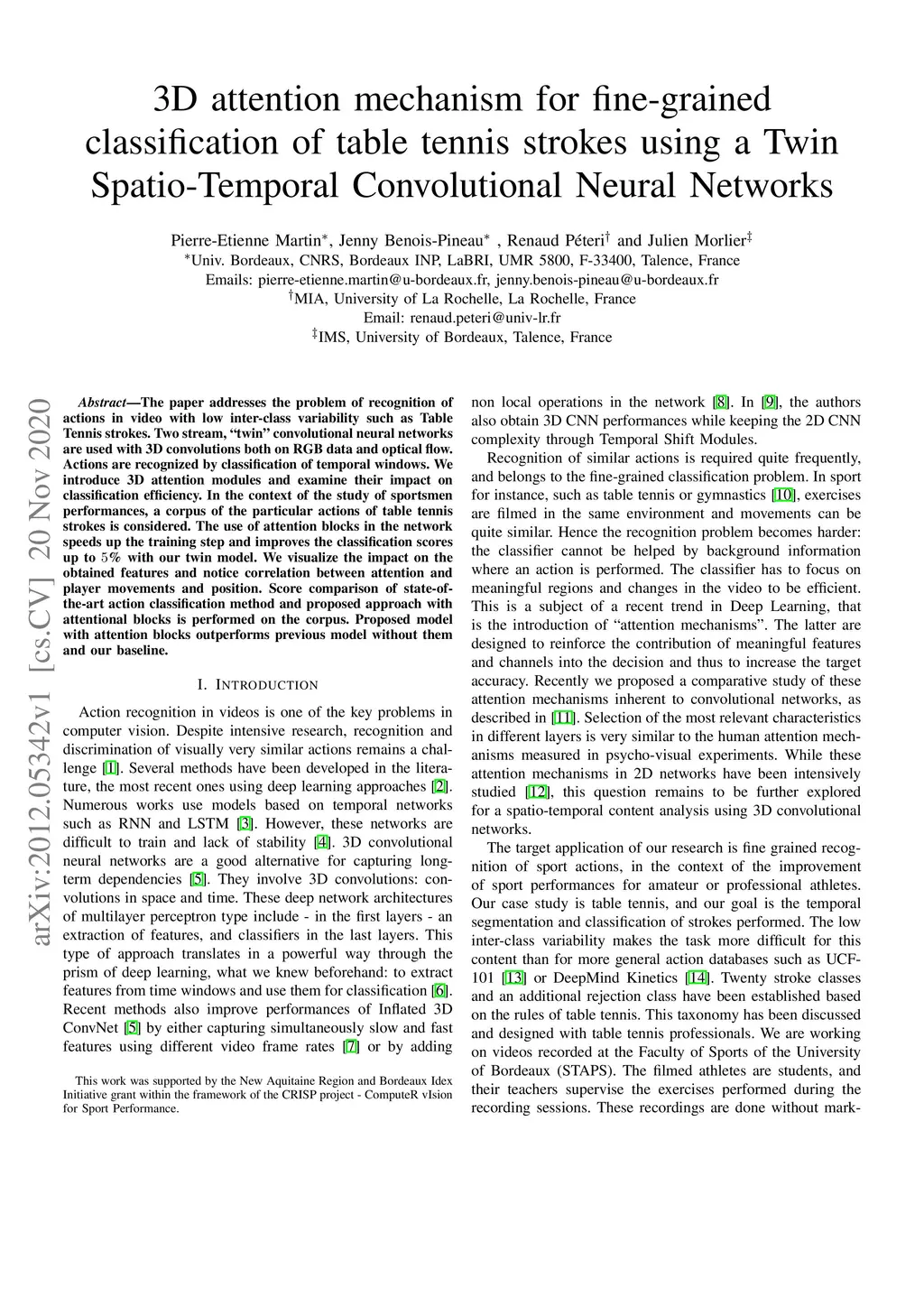 The paper addresses the problem of recognition of actions in video with low inter-class variability such as Table Tennis strokes. Two stream, "twin" convolutional neural networks are used with 3D convolutions both on RGB data and optical flow. Actions are recognized by classification of temporal windows. We introduce 3D attention modules and examine their impact on classification efficiency. In the context of the study of sportsmen performances, a corpus of the particular actions of table tennis strokes is considered. The use of attention blocks in the network speeds up the training step and improves the classification scores up to 5% with our twin model. We visualize the impact on the obtained features and notice correlation between attention and player movements and position. Score comparison of state-of-the-art action classification method and proposed approach with attentional blocks is performed on the corpus. Proposed model with attention blocks outperforms previous model without them and our baseline.