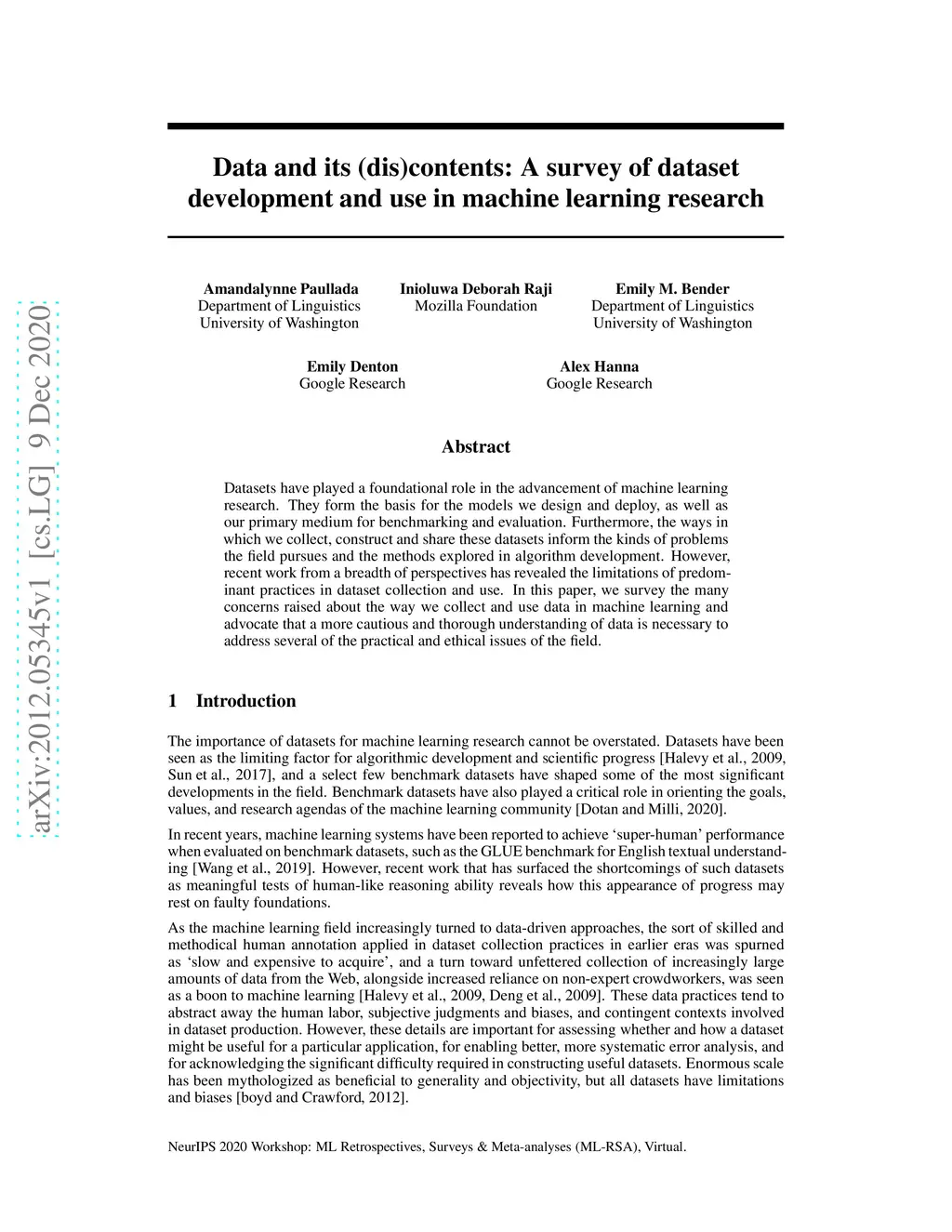 Datasets have played a foundational role in the advancement of machine learning research. They form the basis for the models we design and deploy, as well as our primary medium for benchmarking and evaluation. Furthermore, the ways in which we collect, construct and share these datasets inform the kinds of problems the field pursues and the methods explored in algorithm development. However, recent work from a breadth of perspectives has revealed the limitations of predominant practices in dataset collection and use. In this paper, we survey the many concerns raised about the way we collect and use data in machine learning and advocate that a more cautious and thorough understanding of data is necessary to address several of the practical and ethical issues of the field.