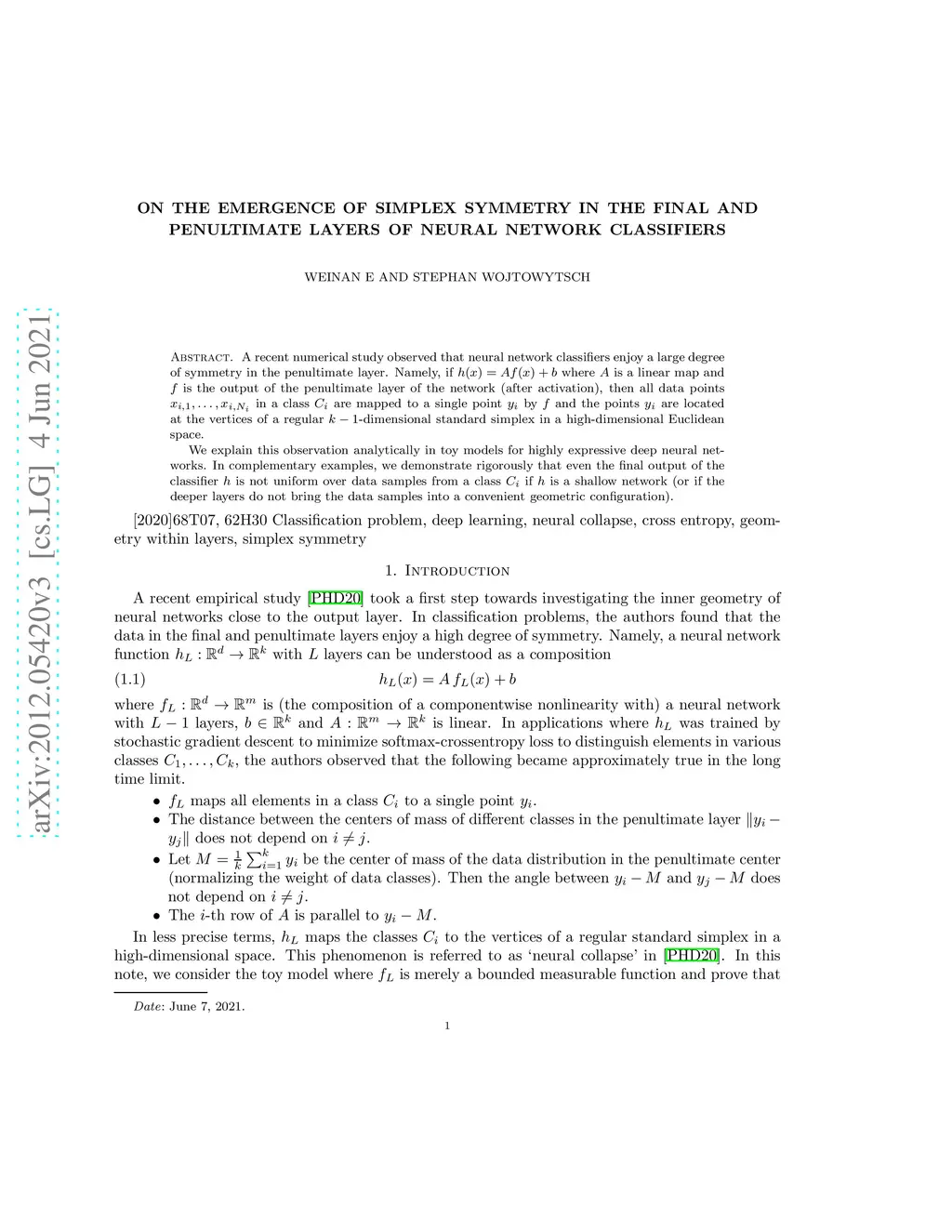 A recent numerical study observed that neural network classifiers enjoy a large degree of symmetry in the penultimate layer. Namely, if where is a linear map and is the output of the penultimate layer of the network (after activation), then all data points in a class are mapped to a single point by and the points are located at the vertices of a regular -dimensional standard simplex in a high-dimensional Euclidean space. We explain this observation analytically in toy models for highly expressive deep neural networks. In complementary examples, we demonstrate rigorously that even the final output of the classifier is not uniform over data samples from a class if is a shallow network (or if the deeper layers do not bring the data samples into a convenient geometric configuration).