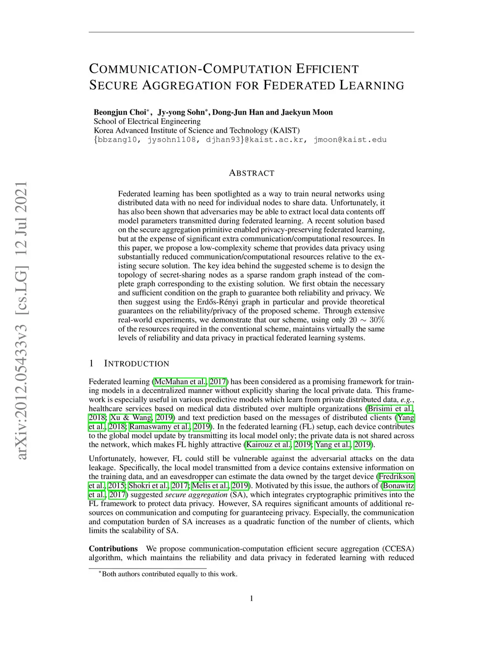 Federated learning has been spotlighted as a way to train neural networks using distributed data with no need for individual nodes to share data. Unfortunately, it has also been shown that adversaries may be able to extract local data contents off model parameters transmitted during federated learning. A recent solution based on the secure aggregation primitive enabled privacy-preserving federated learning, but at the expense of significant extra communication/computational resources. In this paper, we propose a low-complexity scheme that provides data privacy using substantially reduced communication/computational resources relative to the existing secure solution. The key idea behind the suggested scheme is to design the topology of secret-sharing nodes as a sparse random graph instead of the complete graph corresponding to the existing solution. We first obtain the necessary and sufficient condition on the graph to guarantee both reliability and privacy. We then suggest using the Erd\H{o}s-R\ényi graph in particular and provide theoretical guarantees on the reliability/privacy of the proposed scheme. Through extensive real-world experiments, we demonstrate that our scheme, using only of the resources required in the conventional scheme, maintains virtually the same levels of reliability and data privacy in practical federated learning systems.