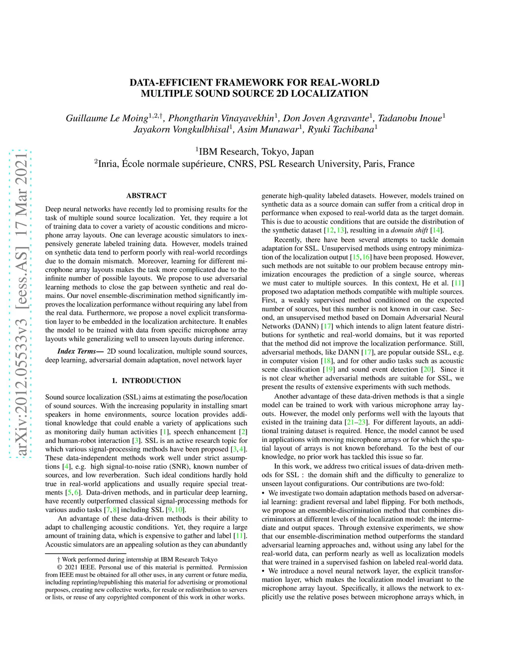 Deep neural networks have recently led to promising results for the task of multiple sound source localization. Yet, they require a lot of training data to cover a variety of acoustic conditions and microphone array layouts. One can leverage acoustic simulators to inexpensively generate labeled training data. However, models trained on synthetic data tend to perform poorly with real-world recordings due to the domain mismatch. Moreover, learning for different microphone array layouts makes the task more complicated due to the infinite number of possible layouts. We propose to use adversarial learning methods to close the gap between synthetic and real domains. Our novel ensemble-discrimination method significantly improves the localization performance without requiring any label from the real data. Furthermore, we propose a novel explicit transformation layer to be embedded in the localization architecture. It enables the model to be trained with data from specific microphone array layouts while generalizing well to unseen layouts during inference.