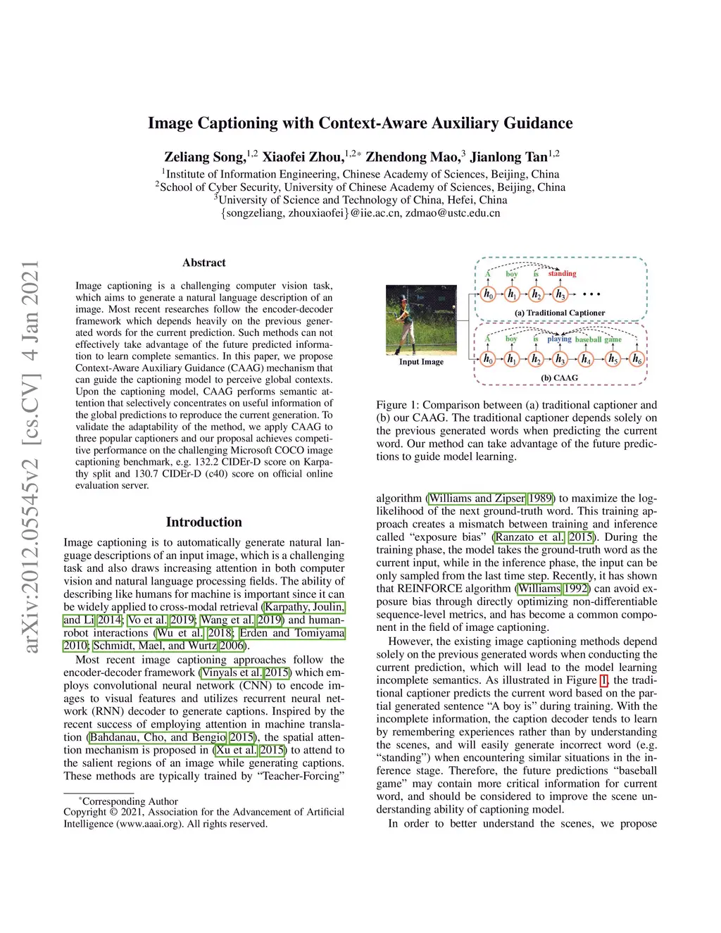 Image captioning is a challenging computer vision task, which aims to generate a natural language description of an image. Most recent researches follow the encoder-decoder framework which depends heavily on the previous generated words for the current prediction. Such methods can not effectively take advantage of the future predicted information to learn complete semantics. In this paper, we propose Context-Aware Auxiliary Guidance (CAAG) mechanism that can guide the captioning model to perceive global contexts. Upon the captioning model, CAAG performs semantic attention that selectively concentrates on useful information of the global predictions to reproduce the current generation. To validate the adaptability of the method, we apply CAAG to three popular captioners and our proposal achieves competitive performance on the challenging Microsoft COCO image captioning benchmark, e.g. 132.2 CIDEr-D score on Karpathy split and 130.7 CIDEr-D (c40) score on official online evaluation server.