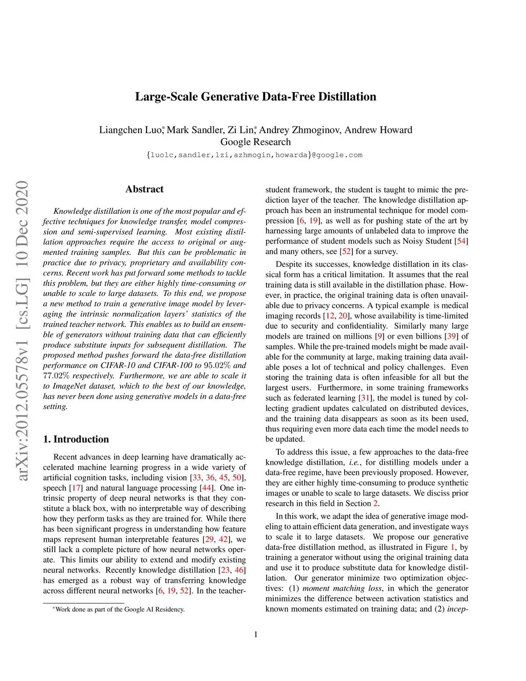 Knowledge distillation is one of the most popular and effective techniques for knowledge transfer, model compression and semi-supervised learning. Most existing distillation approaches require the access to original or augmented training samples. But this can be problematic in practice due to privacy, proprietary and availability concerns. Recent work has put forward some methods to tackle this problem, but they are either highly time-consuming or unable to scale to large datasets. To this end, we propose a new method to train a generative image model by leveraging the intrinsic normalization layers' statistics of the trained teacher network. This enables us to build an ensemble of generators without training data that can efficiently produce substitute inputs for subsequent distillation. The proposed method pushes forward the data-free distillation performance on CIFAR-10 and CIFAR-100 to 95.02% and 77.02% respectively. Furthermore, we are able to scale it to ImageNet dataset, which to the best of our knowledge, has never been done using generative models in a data-free setting.