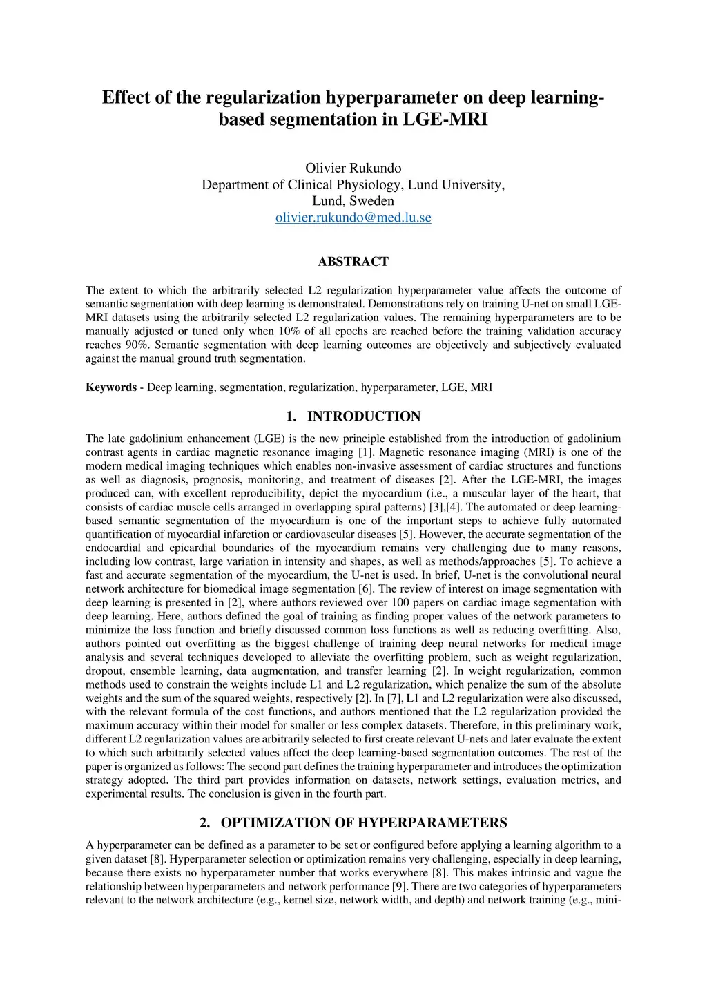The extent to which the arbitrarily selected L2 regularization hyperparameter value affects the outcome of semantic segmentation with deep learning is demonstrated. Demonstrations rely on training U-net on small LGE-MRI datasets using the arbitrarily selected L2 regularization values. The remaining hyperparameters are to be manually adjusted or tuned only when 10 % of all epochs are reached before the training validation accuracy reaches 90%. Semantic segmentation with deep learning outcomes are objectively and subjectively evaluated against the manual ground truth segmentation.