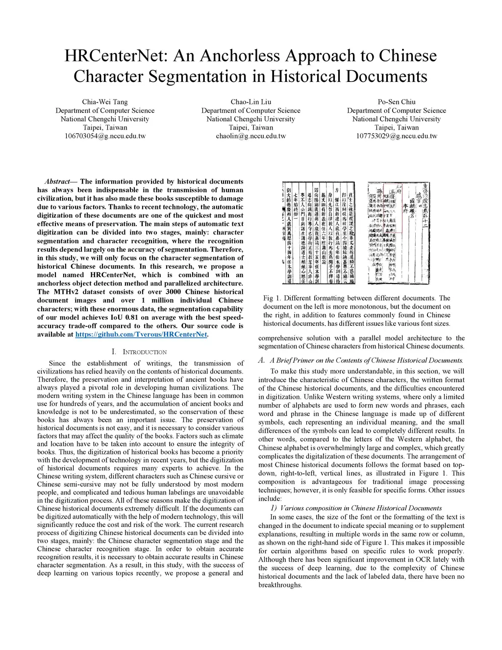 HRCenterNet: An Anchorless Approach to Chinese Character Segmentation in