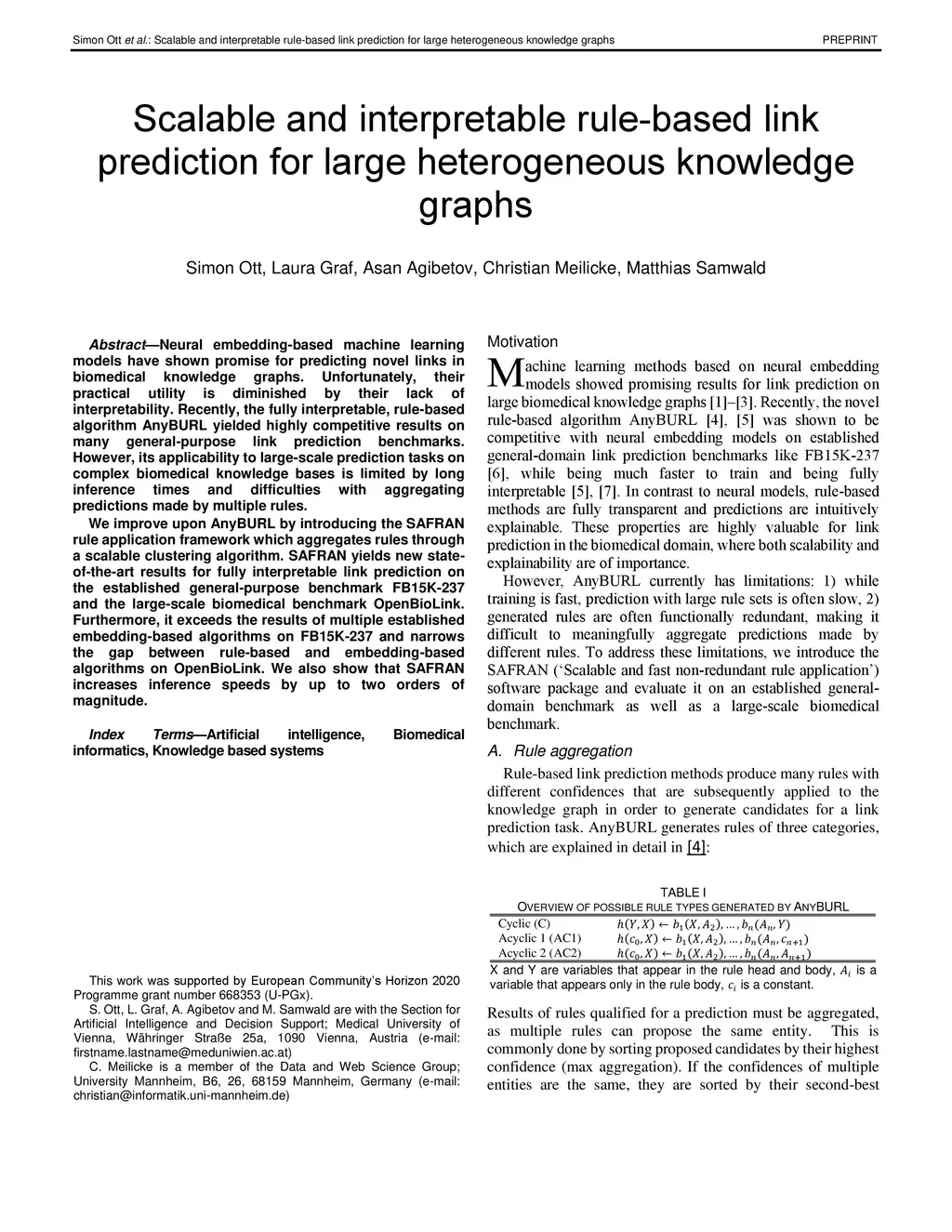Neural embedding-based machine learning models have shown promise for predicting novel links in biomedical knowledge graphs. Unfortunately, their practical utility is diminished by their lack of interpretability. Recently, the fully interpretable, rule-based algorithm AnyBURL yielded highly competitive results on many general-purpose link prediction benchmarks. However, its applicability to large-scale prediction tasks on complex biomedical knowledge bases is limited by long inference times and difficulties with aggregating predictions made by multiple rules. We improve upon AnyBURL by introducing the SAFRAN rule application framework which aggregates rules through a scalable clustering algorithm. SAFRAN yields new state-of-the-art results for fully interpretable link prediction on the established general-purpose benchmark FB15K-237 and the large-scale biomedical benchmark OpenBioLink. Furthermore, it exceeds the results of multiple established embedding-based algorithms on FB15K-237 and narrows the gap between rule-based and embedding-based algorithms on OpenBioLink. We also show that SAFRAN increases inference speeds by up to two orders of magnitude.
