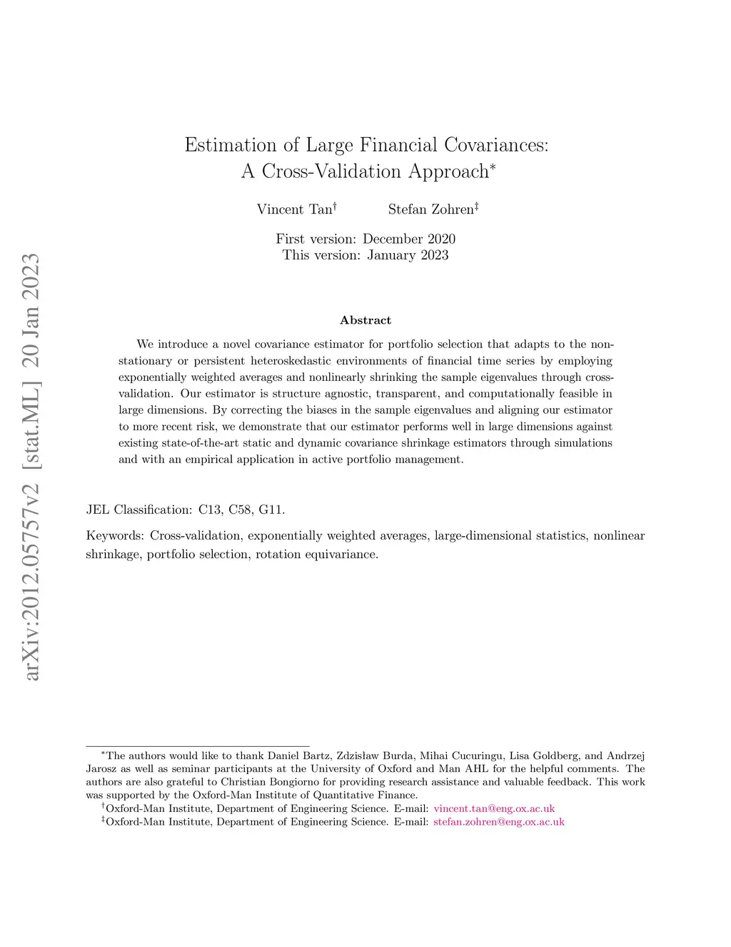 We introduce a novel covariance estimator that exploits the heteroscedastic nature of financial time series by employing exponential weighted moving averages and shrinking the in-sample eigenvalues through cross-validation. Our estimator is model-agnostic in that we make no assumptions on the distribution of the random entries of the matrix or structure of the covariance matrix. Additionally, we show how Random Matrix Theory can provide guidance for automatic tuning of the hyperparameter which characterizes the time scale for the dynamics of the estimator. By attenuating the noise from both the cross-sectional and time-series dimensions, we empirically demonstrate the superiority of our estimator over competing estimators that are based on exponentially-weighted and uniformly-weighted covariance matrices.