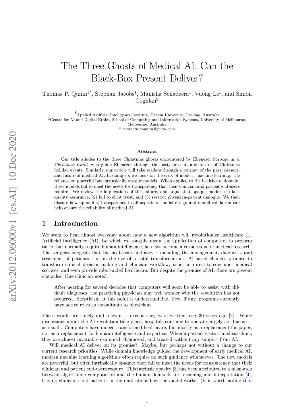 Our title alludes to the three Christmas ghosts encountered by Ebenezer Scrooge in \textit{A Christmas Carol}, who guide Ebenezer through the past, present, and future of Christmas holiday events. Similarly, our article will take readers through a journey of the past, present, and future of medical AI. In doing so, we focus on the crux of modern machine learning: the reliance on powerful but intrinsically opaque models. When applied to the healthcare domain, these models fail to meet the needs for transparency that their clinician and patient end-users require. We review the implications of this failure, and argue that opaque models (1) lack quality assurance, (2) fail to elicit trust, and (3) restrict physician-patient dialogue. We then discuss how upholding transparency in all aspects of model design and model validation can help ensure the reliability of medical AI.