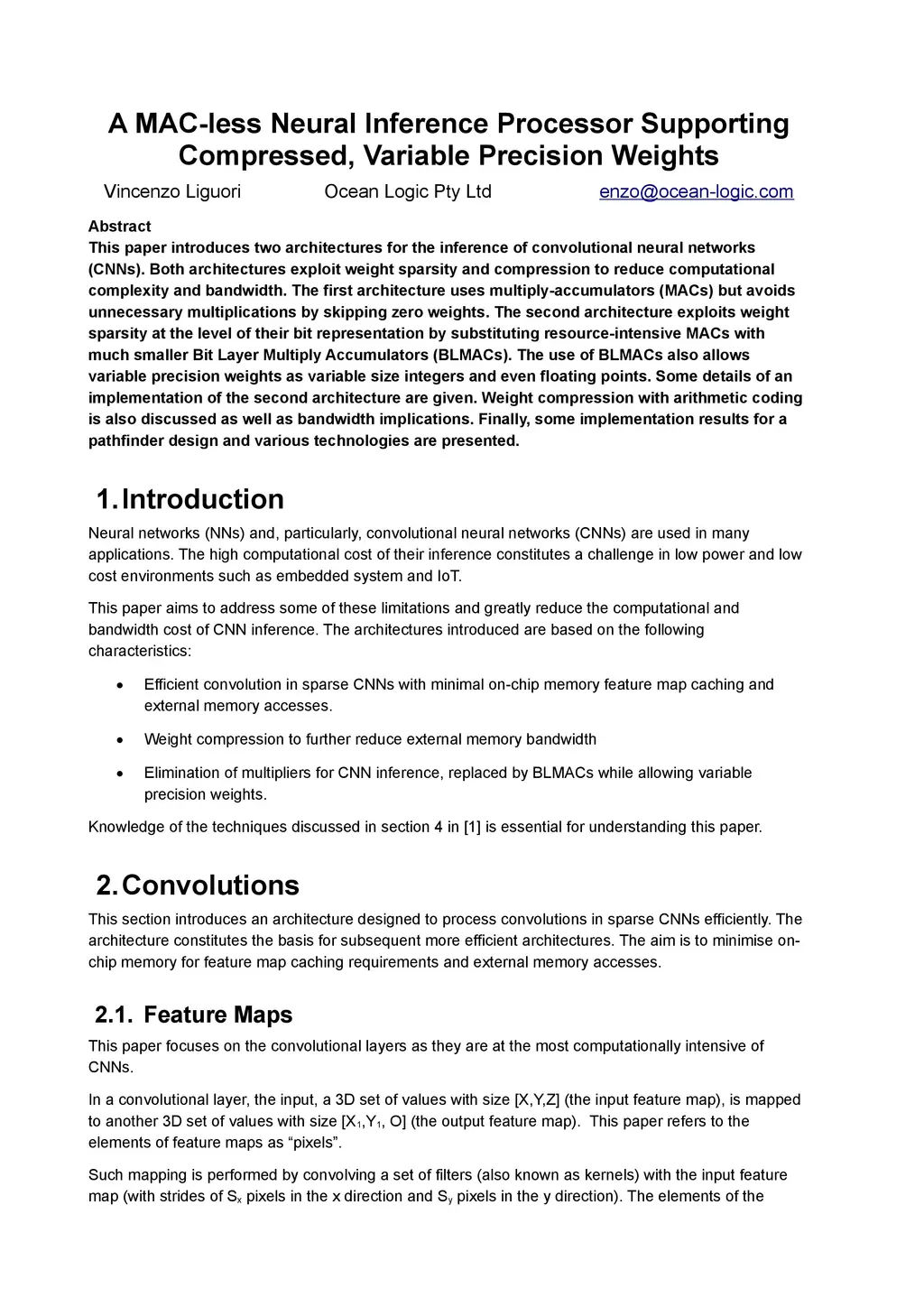 This paper introduces two architectures for the inference of convolutional neural networks (CNNs). Both architectures exploit weight sparsity and compression to reduce computational complexity and bandwidth. The first architecture uses multiply-accumulators (MACs) but avoids unnecessary multiplications by skipping zero weights. The second architecture exploits weight sparsity at the level of their bit representation by substituting resource-intensive MACs with much smaller Bit Layer Multiply Accumulators (BLMACs). The use of BLMACs also allows variable precision weights as variable size integers and even floating points. Some details of an implementation of the second architecture are given. Weight compression with arithmetic coding is also discussed as well as bandwidth implications. Finally, some implementation results for a pathfinder design and various technologies are presented.