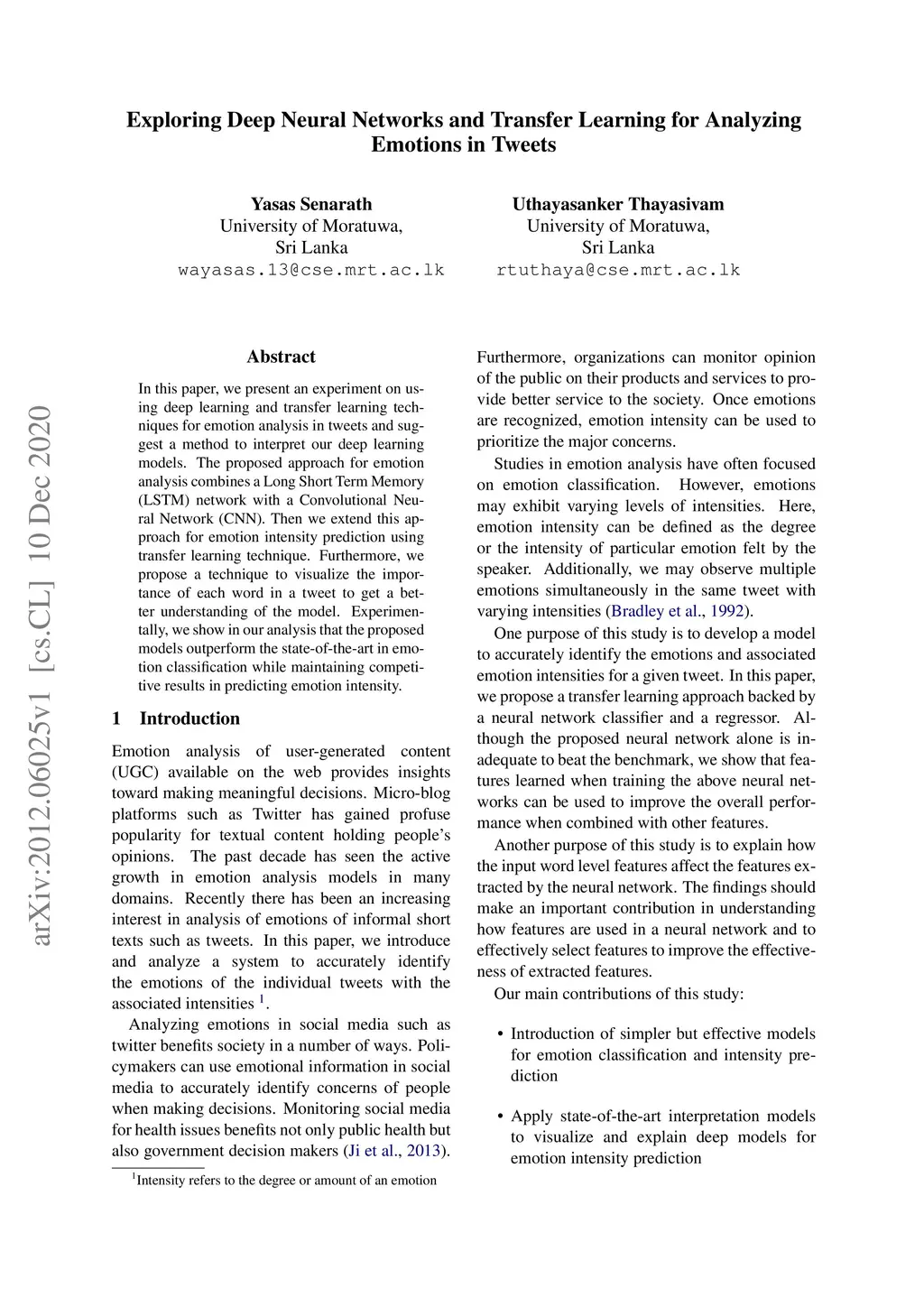 In this paper, we present an experiment on using deep learning and transfer learning techniques for emotion analysis in tweets and suggest a method to interpret our deep learning models. The proposed approach for emotion analysis combines a Long Short Term Memory (LSTM) network with a Convolutional Neural Network (CNN). Then we extend this approach for emotion intensity prediction using transfer learning technique. Furthermore, we propose a technique to visualize the importance of each word in a tweet to get a better understanding of the model. Experimentally, we show in our analysis that the proposed models outperform the state-of-the-art in emotion classification while maintaining competitive results in predicting emotion intensity.