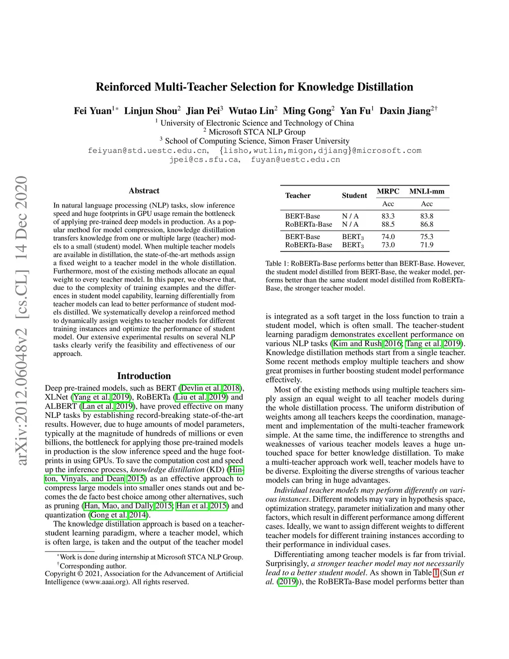 In natural language processing (NLP) tasks, slow inference speed and huge footprints in GPU usage remain the bottleneck of applying pre-trained deep models in production. As a popular method for model compression, knowledge distillation transfers knowledge from one or multiple large (teacher) models to a small (student) model. When multiple teacher models are available in distillation, the state-of-the-art methods assign a fixed weight to a teacher model in the whole distillation. Furthermore, most of the existing methods allocate an equal weight to every teacher model. In this paper, we observe that, due to the complexity of training examples and the differences in student model capability, learning differentially from teacher models can lead to better performance of student models distilled. We systematically develop a reinforced method to dynamically assign weights to teacher models for different training instances and optimize the performance of student model. Our extensive experimental results on several NLP tasks clearly verify the feasibility and effectiveness of our approach.
