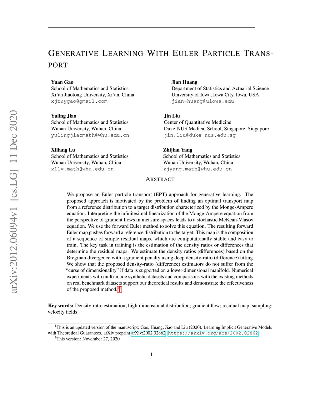 We propose an Euler particle transport (EPT) approach for generative learning. The proposed approach is motivated by the problem of finding an optimal transport map from a reference distribution to a target distribution characterized by the Monge-Ampere equation. Interpreting the infinitesimal linearization of the Monge-Ampere equation from the perspective of gradient flows in measure spaces leads to a stochastic McKean-Vlasov equation. We use the forward Euler method to solve this equation. The resulting forward Euler map pushes forward a reference distribution to the target. This map is the composition of a sequence of simple residual maps, which are computationally stable and easy to train. The key task in training is the estimation of the density ratios or differences that determine the residual maps. We estimate the density ratios (differences) based on the Bregman divergence with a gradient penalty using deep density-ratio (difference) fitting. We show that the proposed density-ratio (difference) estimators do not suffer from the "curse of dimensionality" if data is supported on a lower-dimensional manifold. Numerical experiments with multi-mode synthetic datasets and comparisons with the existing methods on real benchmark datasets support our theoretical results and demonstrate the effectiveness of the proposed method.