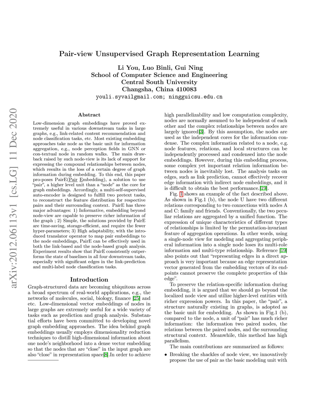 Low-dimension graph embeddings have proved extremely useful in various downstream tasks in large graphs, e.g., link-related content recommendation and node classification tasks, etc. Most existing embedding approaches take nodes as the basic unit for information aggregation, e.g., node perception fields in GNN or con-textual nodes in random walks. The main drawback raised by such node-view is its lack of support for expressing the compound relationships between nodes, which results in the loss of a certain degree of graph information during embedding. To this end, this paper pro-poses PairE(Pair Embedding), a solution to use "pair", a higher level unit than a "node" as the core for graph embeddings. Accordingly, a multi-self-supervised auto-encoder is designed to fulfill two pretext tasks, to reconstruct the feature distribution for respective pairs and their surrounding context. PairE has three major advantages: 1) Informative, embedding beyond node-view are capable to preserve richer information of the graph; 2) Simple, the solutions provided by PairE are time-saving, storage-efficient, and require the fewer hyper-parameters; 3) High adaptability, with the introduced translator operator to map pair embeddings to the node embeddings, PairE can be effectively used in both the link-based and the node-based graph analysis. Experiment results show that PairE consistently outperforms the state of baselines in all four downstream tasks, especially with significant edges in the link-prediction and multi-label node classification tasks.