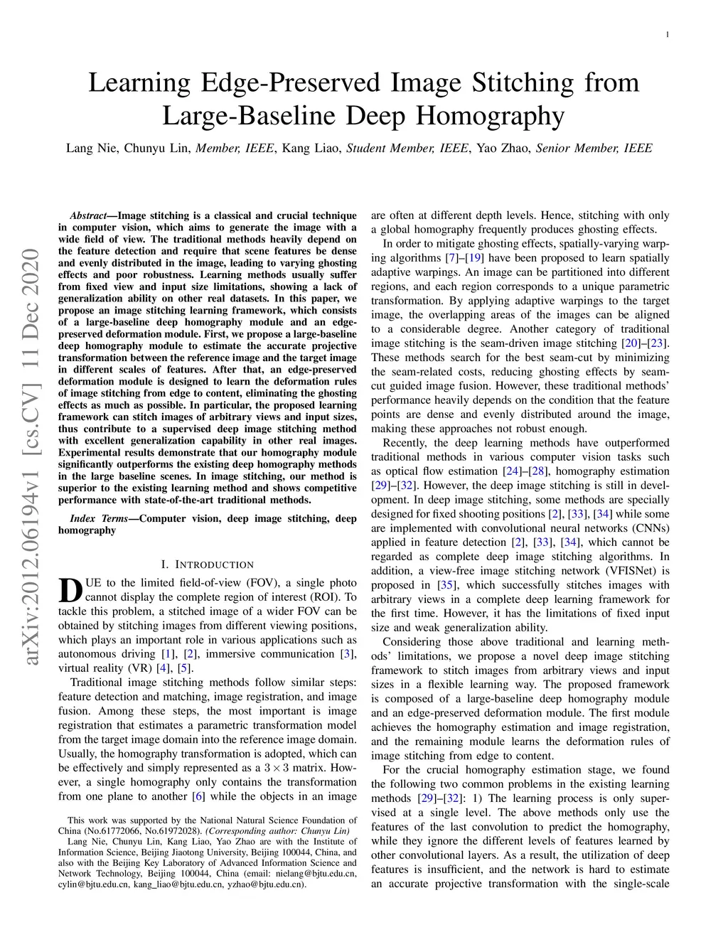 Image stitching is a classical and crucial technique in computer vision, which aims to generate the image with a wide field of view. The traditional methods heavily depend on the feature detection and require that scene features be dense and evenly distributed in the image, leading to varying ghosting effects and poor robustness. Learning methods usually suffer from fixed view and input size limitations, showing a lack of generalization ability on other real datasets. In this paper, we propose an image stitching learning framework, which consists of a large-baseline deep homography module and an edge-preserved deformation module. First, we propose a large-baseline deep homography module to estimate the accurate projective transformation between the reference image and the target image in different scales of features. After that, an edge-preserved deformation module is designed to learn the deformation rules of image stitching from edge to content, eliminating the ghosting effects as much as possible. In particular, the proposed learning framework can stitch images of arbitrary views and input sizes, thus contribute to a supervised deep image stitching method with excellent generalization capability in other real images. Experimental results demonstrate that our homography module significantly outperforms the existing deep homography methods in the large baseline scenes. In image stitching, our method is superior to the existing learning method and shows competitive performance with state-of-the-art traditional methods.