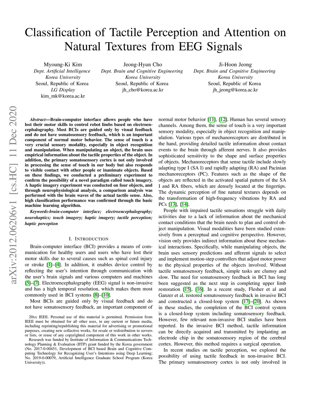 Brain-computer interface allows people who have lost their motor skills to control robot limbs based on electroencephalography. Most BCIs are guided only by visual feedback and do not have somatosensory feedback, which is an important component of normal motor behavior. The sense of touch is a very crucial sensory modality, especially in object recognition and manipulation. When manipulating an object, the brain uses empirical information about the tactile properties of the object. In addition, the primary somatosensory cortex is not only involved in processing the sense of touch in our body but also responds to visible contact with other people or inanimate objects. Based on these findings, we conducted a preliminary experiment to confirm the possibility of a novel paradigm called touch imagery. A haptic imagery experiment was conducted on four objects, and through neurophysiological analysis, a comparison analysis was performed with the brain waves of the actual tactile sense. Also, high classification performance was confirmed through the basic machine learning algorithm.