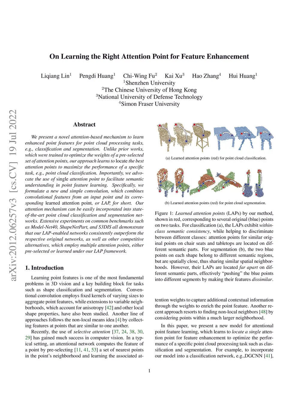 We present a novel attention-based mechanism to learn enhanced point features for point cloud processing tasks, e.g., classification and segmentation. Unlike prior works, which were trained to optimize the weights of a pre-selected set of attention points, our approach learns to locate the best attention points to maximize the performance of a specific task, e.g., point cloud classification. Importantly, we advocate the use of single attention point to facilitate semantic understanding in point feature learning. Specifically, we formulate a new and simple convolution, which combines convolutional features from an input point and its corresponding learned attention point, or LAP, for short. Our attention mechanism can be easily incorporated into state-of-the-art point cloud classification and segmentation networks. Extensive experiments on common benchmarks such as ModelNet40, ShapeNetPart, and S3DIS all demonstrate that our LAP-enabled networks consistently outperform the respective original networks, as well as other competitive alternatives, which employ multiple attention points, either pre-selected or learned under our LAP framework.