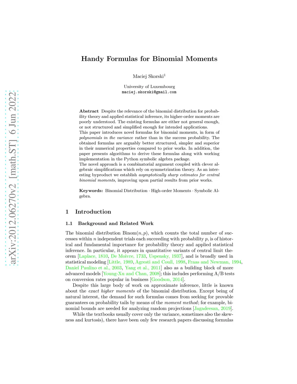 Despite the relevance of the binomial distribution for probability theory and applied statistical inference, its higher-order moments are poorly understood. The existing formulas are either not general enough, or not structured and simplified enough for intended applications. This paper introduces novel formulas for binomial moments, in form of \emph{polynomials in the variance} rather than in the success probability. The obtained formulas are arguably better structured, simpler and superior in their numerical properties compared to prior works. In addition, the paper presents algorithms to derive these formulas along with working implementation in the Python symbolic algebra package. The novel approach is a combinatorial argument coupled with clever algebraic simplifications which rely on symmetrization theory. As an interesting byproduct we establish \emph{asymptotically sharp estimates for central binomial moments}, improving upon partial results from prior works.