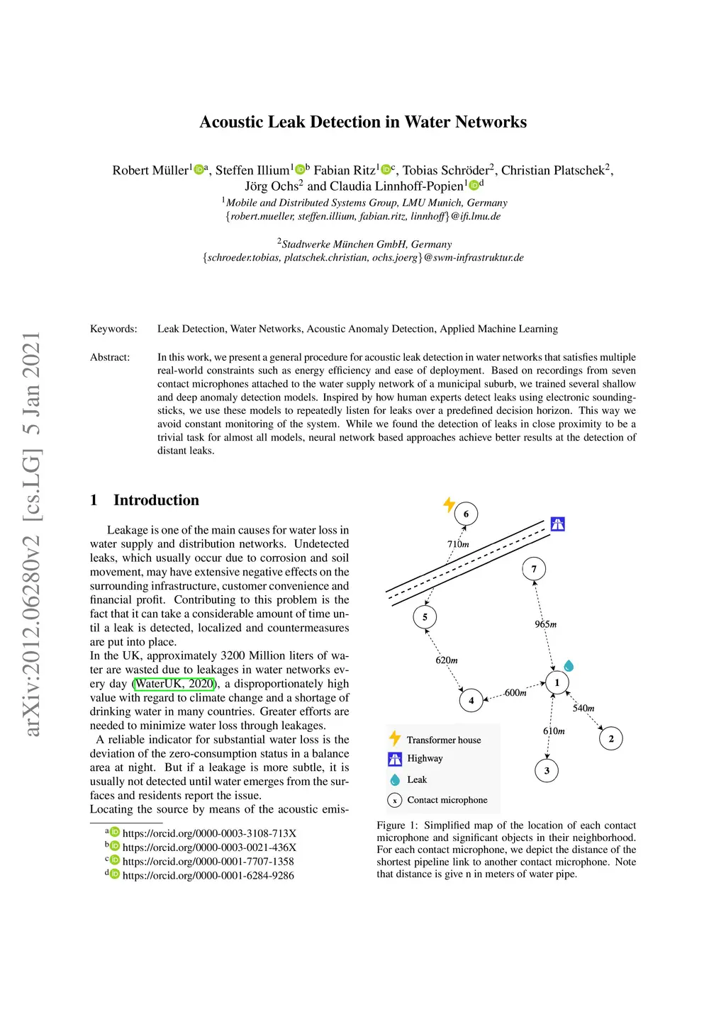 In this work, we present a general procedure for acoustic leak detection in water networks that satisfies multiple real-world constraints such as energy efficiency and ease of deployment. Based on recordings from seven contact microphones attached to the water supply network of a municipal suburb, we trained several shallow and deep anomaly detection models. Inspired by how human experts detect leaks using electronic sounding-sticks, we use these models to repeatedly listen for leaks over a predefined decision horizon. This way we avoid constant monitoring of the system. While we found the detection of leaks in close proximity to be a trivial task for almost all models, neural network based approaches achieve better results at the detection of distant leaks.