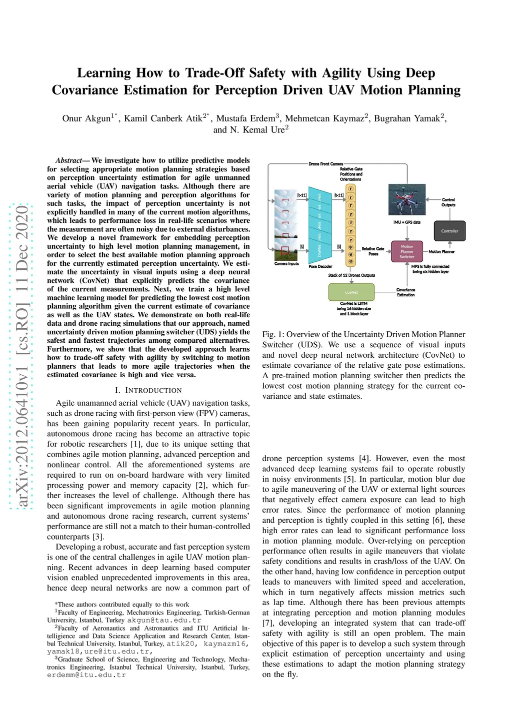 We investigate how to utilize predictive models for selecting appropriate motion planning strategies based on perception uncertainty estimation for agile unmanned aerial vehicle (UAV) navigation tasks. Although there are variety of motion planning and perception algorithms for such tasks, the impact of perception uncertainty is not explicitly handled in many of the current motion algorithms, which leads to performance loss in real-life scenarios where the measurement are often noisy due to external disturbances. We develop a novel framework for embedding perception uncertainty to high level motion planning management, in order to select the best available motion planning approach for the currently estimated perception uncertainty. We estimate the uncertainty in visual inputs using a deep neural network (CovNet) that explicitly predicts the covariance of the current measurements. Next, we train a high level machine learning model for predicting the lowest cost motion planning algorithm given the current estimate of covariance as well as the UAV states. We demonstrate on both real-life data and drone racing simulations that our approach, named uncertainty driven motion planning switcher (UDS) yields the safest and fastest trajectories among compared alternatives. Furthermore, we show that the developed approach learns how to trade-off safety with agility by switching to motion planners that leads to more agile trajectories when the estimated covariance is high and vice versa.