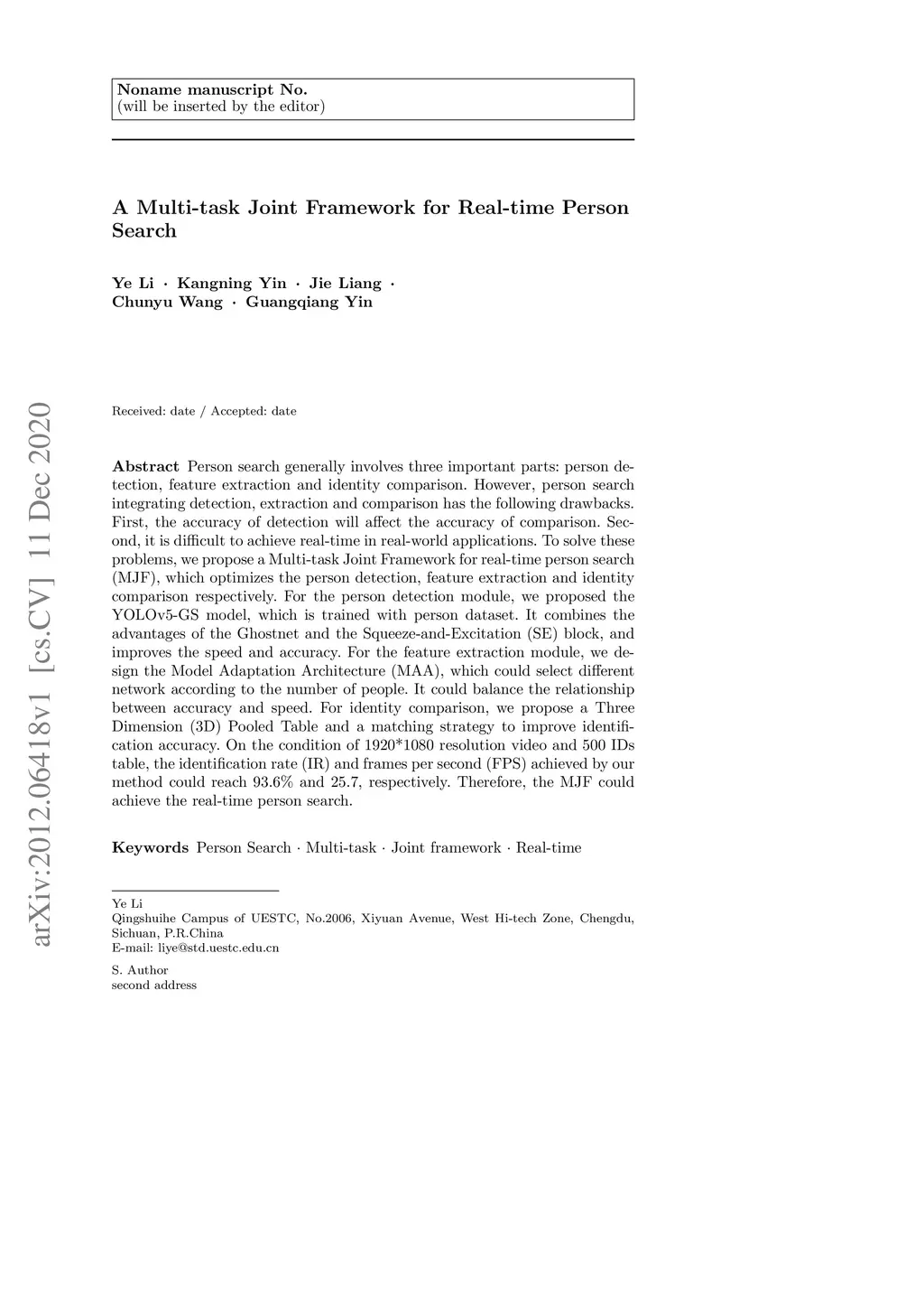 Person search generally involves three important parts: person detection, feature extraction and identity comparison. However, person search integrating detection, extraction and comparison has the following drawbacks. Firstly, the accuracy of detection will affect the accuracy of comparison. Secondly, it is difficult to achieve real-time in real-world applications. To solve these problems, we propose a Multi-task Joint Framework for real-time person search (MJF), which optimizes the person detection, feature extraction and identity comparison respectively. For the person detection module, we proposed the YOLOv5-GS model, which is trained with person dataset. It combines the advantages of the Ghostnet and the Squeeze-and-Excitation (SE) block, and improves the speed and accuracy. For the feature extraction module, we design the Model Adaptation Architecture (MAA), which could select different network according to the number of people. It could balance the relationship between accuracy and speed. For identity comparison, we propose a Three Dimension (3D) Pooled Table and a matching strategy to improve identification accuracy. On the condition of 1920*1080 resolution video and 500 IDs table, the identification rate (IR) and frames per second (FPS) achieved by our method could reach 93.6% and 25.7,