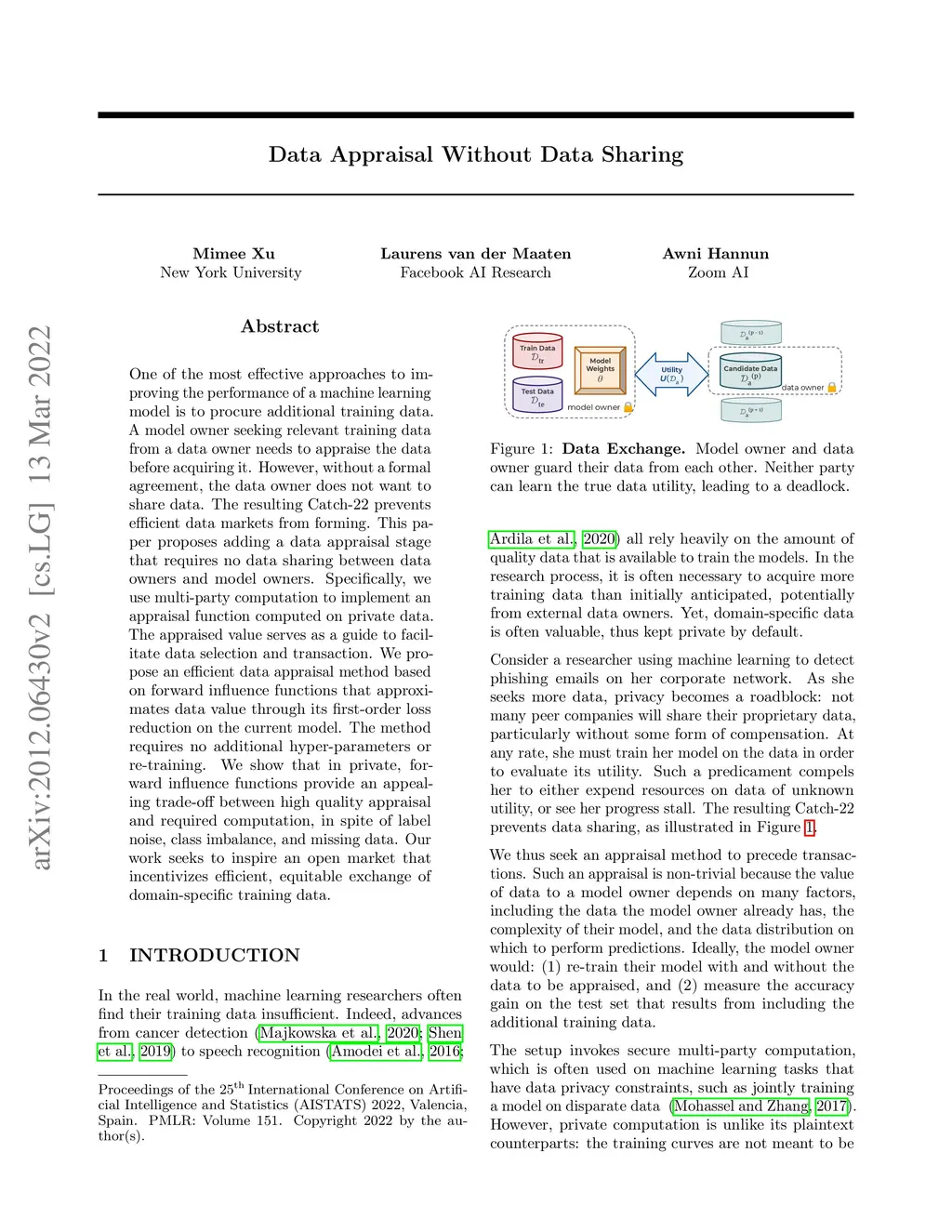 One of the most effective approaches to improving the performance of a machine learning model is to procure additional training data. A model owner seeking relevant training data from a data owner needs to appraise the data before acquiring it. However, without a formal agreement, the data owner does not want to share data. The resulting Catch-22 prevents efficient data markets from forming. This paper proposes adding a data appraisal stage that requires no data sharing between data owners and model owners. Specifically, we use multi-party computation to implement an appraisal function computed on private data. The appraised value serves as a guide to facilitate data selection and transaction. We propose an efficient data appraisal method based on forward influence functions that approximates data value through its first-order loss reduction on the current model. The method requires no additional hyper-parameters or re-training. We show that in private, forward influence functions provide an appealing trade-off between high quality appraisal and required computation, in spite of label noise, class imbalance, and missing data. Our work seeks to inspire an open market that incentivizes efficient, equitable exchange of domain-specific training data.