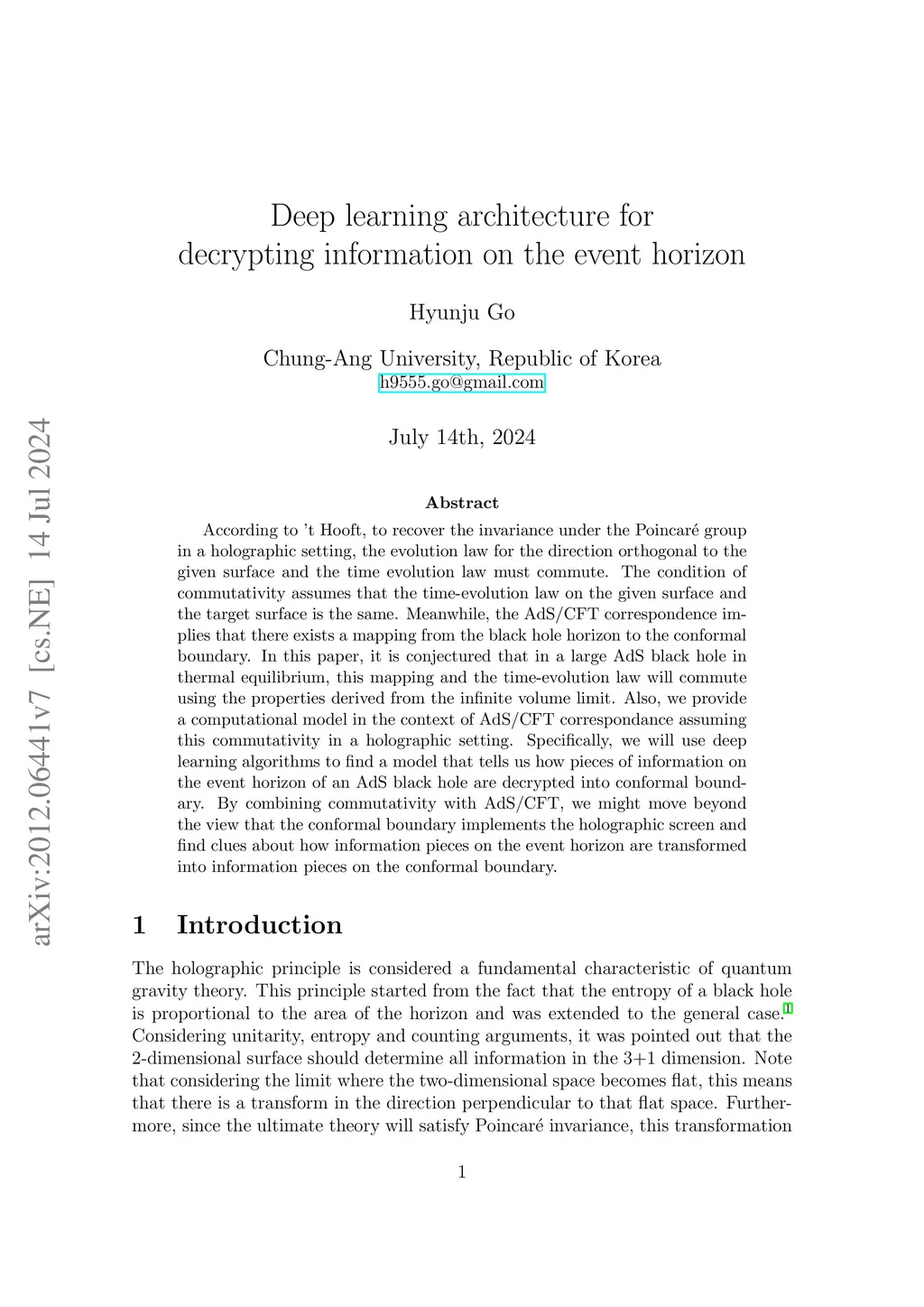 According to 't Hooft, to recover the invariance under the Poincar\é group in a holographic setting, the evolution law for the direction orthogonal to the given surface and the time evolution law must commute. The condition of commutativity assumes that the time-evolution law on the given surface and the target surface is the same. Meanwhile, the AdS/CFT correspondence implies that there exists a mapping from the black hole horizon to the conformal boundary. In this paper, it is conjectured that in a large AdS black hole in thermal equilibrium, this mapping and the time-evolution law will commute using the properties derived from the infinite volume limit. Also, we provide a computational model in the context of AdS/CFT correspondance assuming this commutativity in a holographic setting. Specifically, we will use deep learning algorithms to find a model that tells us how pieces of information on the event horizon of an AdS black hole are decrypted into conformal boundary. By combining commutativity with AdS/CFT, we might move beyond the view that the conformal boundary implements the holographic screen and find clues about how information pieces on the event horizon are transformed into information pieces on the conformal boundary