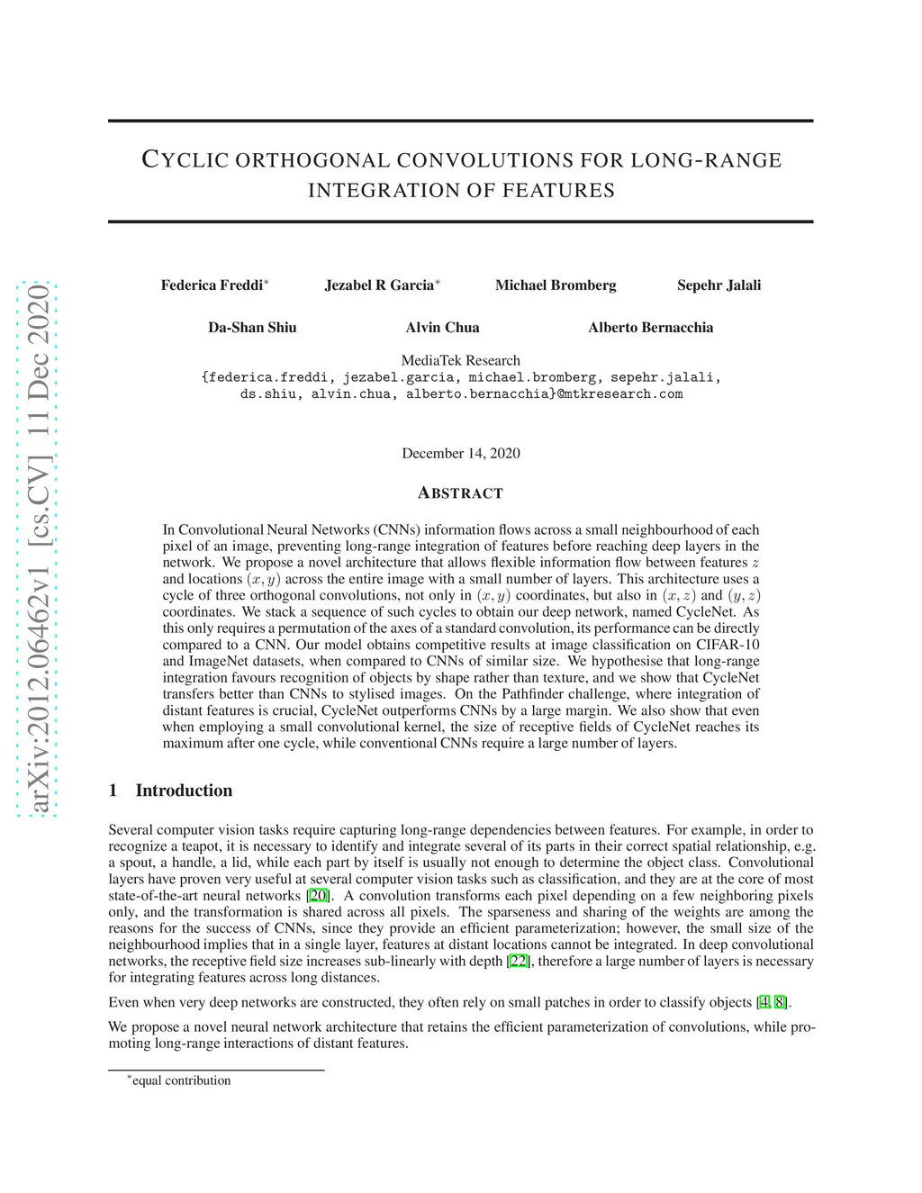 In Convolutional Neural Networks (CNNs) information flows across a small neighbourhood of each pixel of an image, preventing long-range integration of features before reaching deep layers in the network. We propose a novel architecture that allows flexible information flow between features and locations across the entire image with a small number of layers. This architecture uses a cycle of three orthogonal convolutions, not only in coordinates, but also in and coordinates. We stack a sequence of such cycles to obtain our deep network, named CycleNet. As this only requires a permutation of the axes of a standard convolution, its performance can be directly compared to a CNN. Our model obtains competitive results at image classification on CIFAR-10 and ImageNet datasets, when compared to CNNs of similar size. We hypothesise that long-range integration favours recognition of objects by shape rather than texture, and we show that CycleNet transfers better than CNNs to stylised images. On the Pathfinder challenge, where integration of distant features is crucial, CycleNet outperforms CNNs by a large margin. We also show that even when employing a small convolutional kernel, the size of receptive fields of CycleNet reaches its maximum after one cycle, while conventional CNNs require a large number of layers.