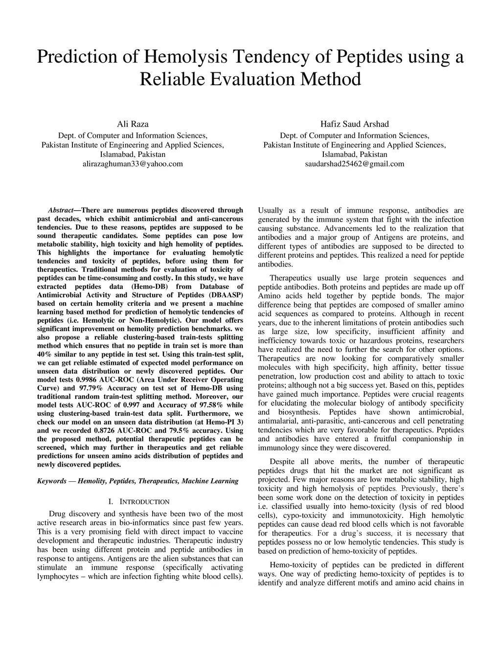 There are numerous peptides discovered through past decades, which exhibit antimicrobial and anti-cancerous tendencies. Due to these reasons, peptides are supposed to be sound therapeutic candidates. Some peptides can pose low metabolic stability, high toxicity and high hemolity of peptides. This highlights the importance for evaluating hemolytic tendencies and toxicity of peptides, before using them for therapeutics. Traditional methods for evaluation of toxicity of peptides can be time-consuming and costly. In this study, we have extracted peptides data (Hemo-DB) from Database of Antimicrobial Activity and Structure of Peptides (DBAASP) based on certain hemolity criteria and we present a machine learning based method for prediction of hemolytic tendencies of peptides (i.e. Hemolytic or Non-Hemolytic). Our model offers significant improvement on hemolity prediction benchmarks. we also propose a reliable clustering-based train-tests splitting method which ensures that no peptide in train set is more than 40% similar to any peptide in test set. Using this train-test split, we can get reliable estimated of expected model performance on unseen data distribution or newly discovered peptides. Our model tests 0.9986 AUC-ROC (Area Under Receiver Operating Curve) and 97.79% Accuracy on test set of Hemo-DB using traditional random train-test splitting method. Moreover, our model tests AUC-ROC of 0.997 and Accuracy of 97.58% while using clustering-based train-test data split. Furthermore, we check our model on an unseen data distribution (at Hemo-PI 3) and we recorded 0.8726 AUC-ROC and 79.5% accuracy. Using the proposed method, potential therapeutic peptides can be screened, which may further in therapeutics and get reliable predictions for unseen amino acids distribution of peptides and newly discovered peptides.