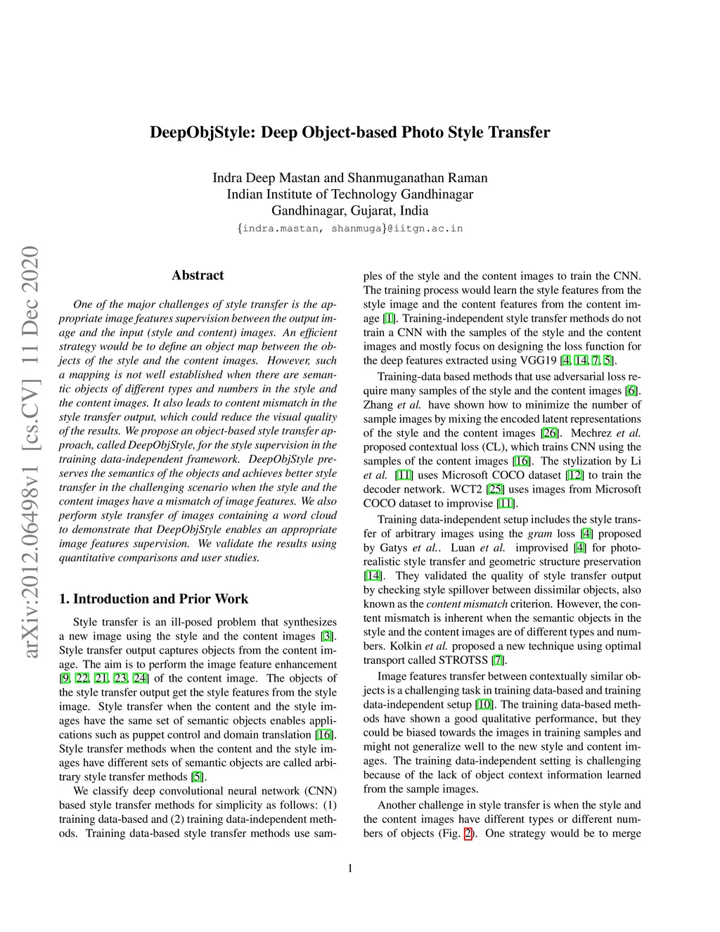 One of the major challenges of style transfer is the appropriate image features supervision between the output image and the input (style and content) images. An efficient strategy would be to define an object map between the objects of the style and the content images. However, such a mapping is not well established when there are semantic objects of different types and numbers in the style and the content images. It also leads to content mismatch in the style transfer output, which could reduce the visual quality of the results. We propose an object-based style transfer approach, called DeepObjStyle, for the style supervision in the training data-independent framework. DeepObjStyle preserves the semantics of the objects and achieves better style transfer in the challenging scenario when the style and the content images have a mismatch of image features. We also perform style transfer of images containing a word cloud to demonstrate that DeepObjStyle enables an appropriate image features supervision. We validate the results using quantitative comparisons and user studies.