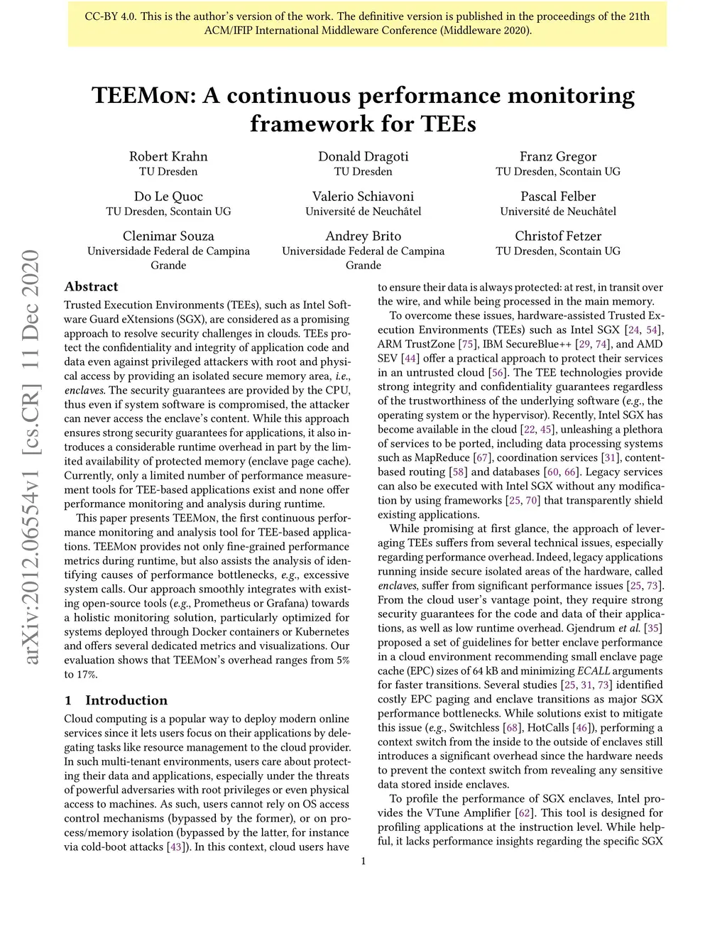 Trusted Execution Environments (TEEs), such as Intel Software Guard eXtensions (SGX), are considered as a promising approach to resolve security challenges in clouds. TEEs protect the confidentiality and integrity of application code and data even against privileged attackers with root and physical access by providing an isolated secure memory area, i.e., enclaves. The security guarantees are provided by the CPU, thus even if system software is compromised, the attacker can never access the enclave's content. While this approach ensures strong security guarantees for applications, it also introduces a considerable runtime overhead in part by the limited availability of protected memory (enclave page cache). Currently, only a limited number of performance measurement tools for TEE-based applications exist and none offer performance monitoring and analysis during runtime. This paper presents TEEMon, the first continuous performance monitoring and analysis tool for TEE-based applications. TEEMon provides not only fine-grained performance metrics during runtime, but also assists the analysis of identifying causes of performance bottlenecks, e.g., excessive system calls. Our approach smoothly integrates with existing open-source tools (e.g., Prometheus or Grafana) towards a holistic monitoring solution, particularly optimized for systems deployed through Docker containers or Kubernetes and offers several dedicated metrics and visualizations. Our evaluation shows that TEEMon's overhead ranges from 5% to 17%.