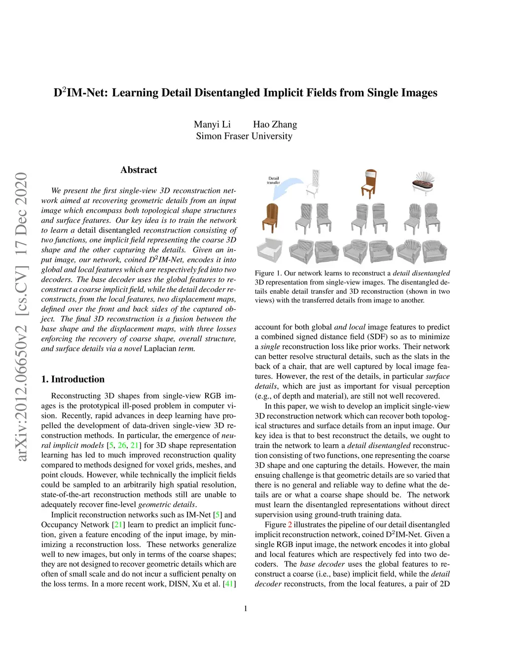 DIM-Net: Learning Detail Disentangled Implicit Fields from Single
