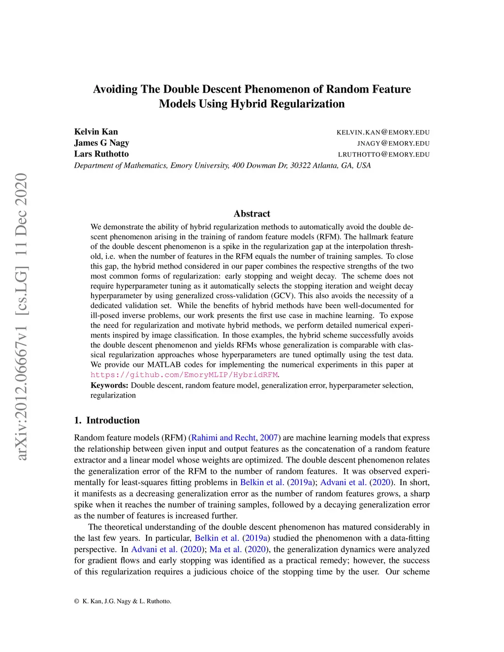 We demonstrate the ability of hybrid regularization methods to automatically avoid the double descent phenomenon arising in the training of random feature models (RFM). The hallmark feature of the double descent phenomenon is a spike in the regularization gap at the interpolation threshold, i.e. when the number of features in the RFM equals the number of training samples. To close this gap, the hybrid method considered in our paper combines the respective strengths of the two most common forms of regularization: early stopping and weight decay. The scheme does not require hyperparameter tuning as it automatically selects the stopping iteration and weight decay hyperparameter by using generalized cross-validation (GCV). This also avoids the necessity of a dedicated validation set. While the benefits of hybrid methods have been well-documented for ill-posed inverse problems, our work presents the first use case in machine learning. To expose the need for regularization and motivate hybrid methods, we perform detailed numerical experiments inspired by image classification. In those examples, the hybrid scheme successfully avoids the double descent phenomenon and yields RFMs whose generalization is comparable with classical regularization approaches whose hyperparameters are tuned optimally using the test data. We provide our MATLAB codes for implementing the numerical experiments in this paper at https://github.com/EmoryMLIP/HybridRFM.