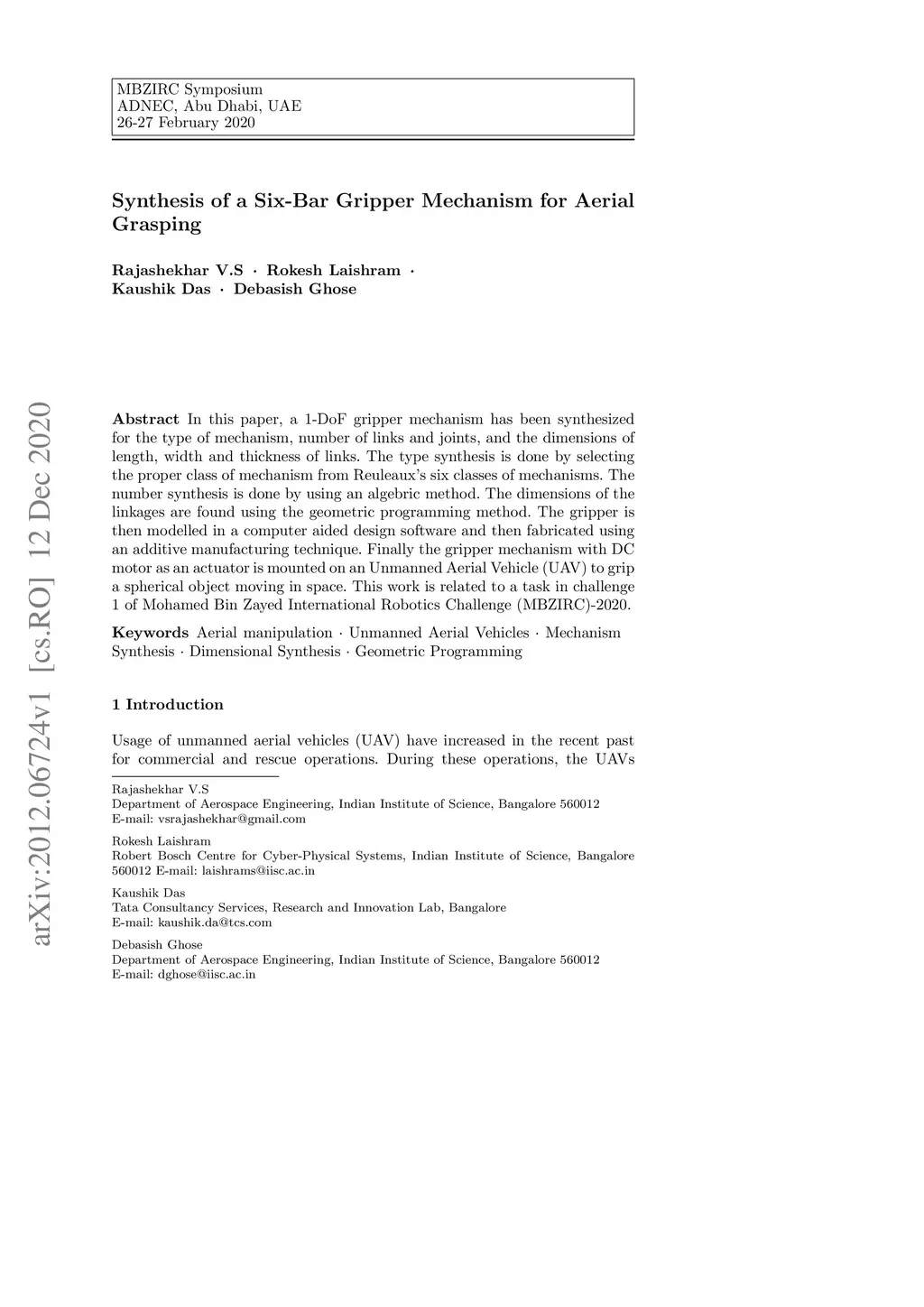 Synthesis of a Six-Bar Gripper Mechanism for Aerial Grasping