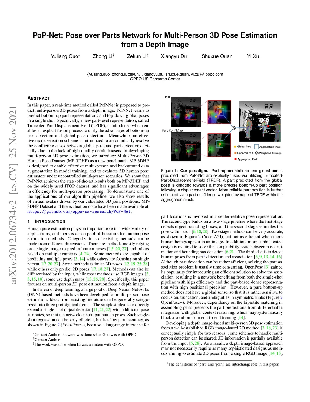 In this paper, a real-time method called PoP-Net is proposed to predict multi-person 3D poses from a depth image. PoP-Net learns to predict bottom-up part representations and top-down global poses in a single shot. Specifically, a new part-level representation, called Truncated Part Displacement Field (TPDF), is introduced which enables an explicit fusion process to unify the advantages of bottom-up part detection and global pose detection. Meanwhile, an effective mode selection scheme is introduced to automatically resolve the conflicting cases between global pose and part detections. Finally, due to the lack of high-quality depth datasets for developing multi-person 3D pose estimation, we introduce Multi-Person 3D Human Pose Dataset (MP-3DHP) as a new benchmark. MP-3DHP is designed to enable effective multi-person and background data augmentation in model training, and to evaluate 3D human pose estimators under uncontrolled multi-person scenarios. We show that PoP-Net achieves the state-of-the-art results both on MP-3DHP and on the widely used ITOP dataset, and has significant advantages in efficiency for multi-person processing. To demonstrate one of the applications of our algorithm pipeline, we also show results of virtual avatars driven by our calculated 3D joint positions. MP-3DHP Dataset and the evaluation code have been made available at: https://github.com/oppo-us-research/PoP-Net.
