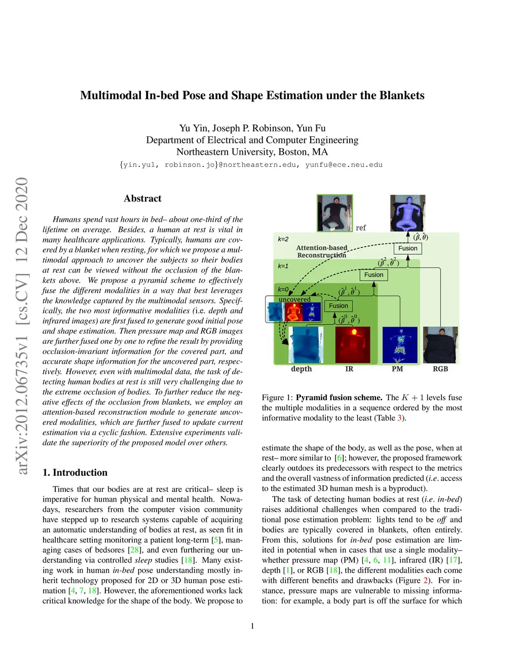 Humans spend vast hours in bed -- about one-third of the lifetime on average. Besides, a human at rest is vital in many healthcare applications. Typically, humans are covered by a blanket when resting, for which we propose a multimodal approach to uncover the subjects so their bodies at rest can be viewed without the occlusion of the blankets above. We propose a pyramid scheme to effectively fuse the different modalities in a way that best leverages the knowledge captured by the multimodal sensors. Specifically, the two most informative modalities (i.e., depth and infrared images) are first fused to generate good initial pose and shape estimation. Then pressure map and RGB images are further fused one by one to refine the result by providing occlusion-invariant information for the covered part, and accurate shape information for the uncovered part, respectively. However, even with multimodal data, the task of detecting human bodies at rest is still very challenging due to the extreme occlusion of bodies. To further reduce the negative effects of the occlusion from blankets, we employ an attention-based reconstruction module to generate uncovered modalities, which are further fused to update current estimation via a cyclic fashion. Extensive experiments validate the superiority of the proposed model over others.