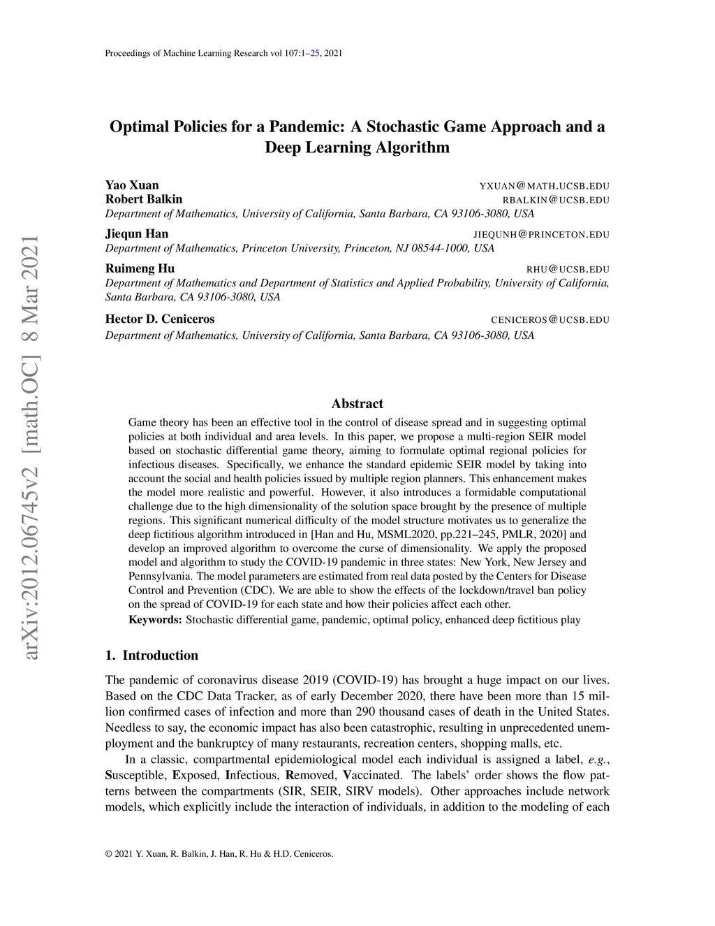 Optimal Policies for a Pandemic: A Stochastic Game Approach and a Deep