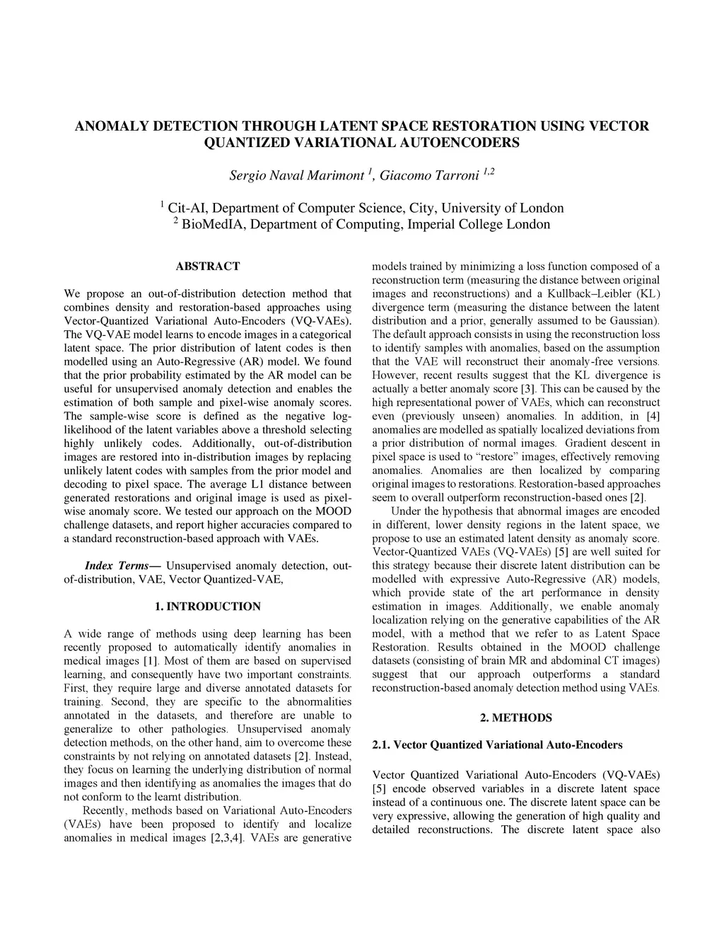 We propose an out-of-distribution detection method that combines density and restoration-based approaches using Vector-Quantized Variational Auto-Encoders (VQ-VAEs). The VQ-VAE model learns to encode images in a categorical latent space. The prior distribution of latent codes is then modelled using an Auto-Regressive (AR) model. We found that the prior probability estimated by the AR model can be useful for unsupervised anomaly detection and enables the estimation of both sample and pixel-wise anomaly scores. The sample-wise score is defined as the negative log-likelihood of the latent variables above a threshold selecting highly unlikely codes. Additionally, out-of-distribution images are restored into in-distribution images by replacing unlikely latent codes with samples from the prior model and decoding to pixel space. The average L1 distance between generated restorations and original image is used as pixel-wise anomaly score. We tested our approach on the MOOD challenge datasets, and report higher accuracies compared to a standard reconstruction-based approach with VAEs.