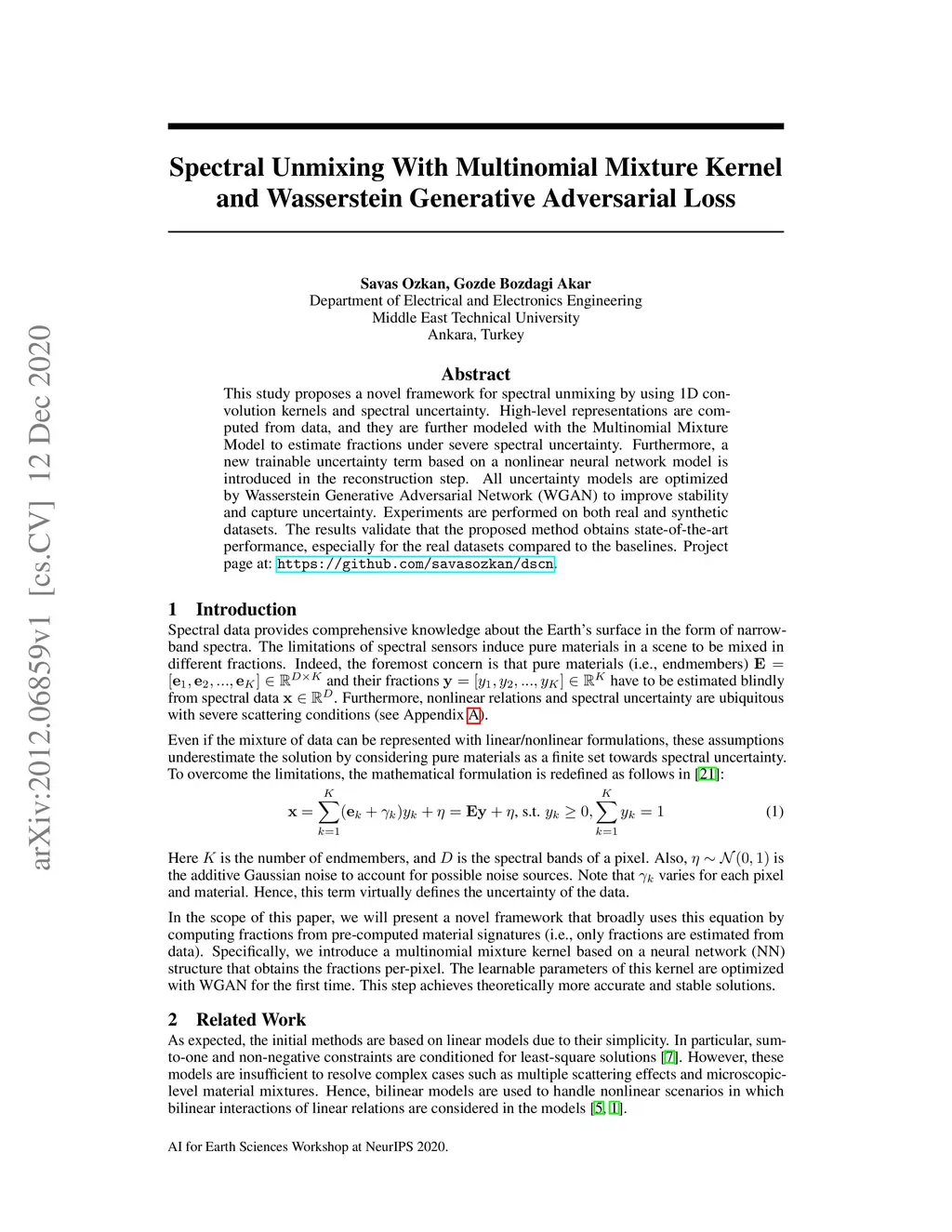 This study proposes a novel framework for spectral unmixing by using 1D convolution kernels and spectral uncertainty. High-level representations are computed from data, and they are further modeled with the Multinomial Mixture Model to estimate fractions under severe spectral uncertainty. Furthermore, a new trainable uncertainty term based on a nonlinear neural network model is introduced in the reconstruction step. All uncertainty models are optimized by Wasserstein Generative Adversarial Network (WGAN) to improve stability and capture uncertainty. Experiments are performed on both real and synthetic datasets. The results validate that the proposed method obtains state-of-the-art performance, especially for the real datasets compared to the baselines. Project page at: https://github.com/savasozkan/dscn.