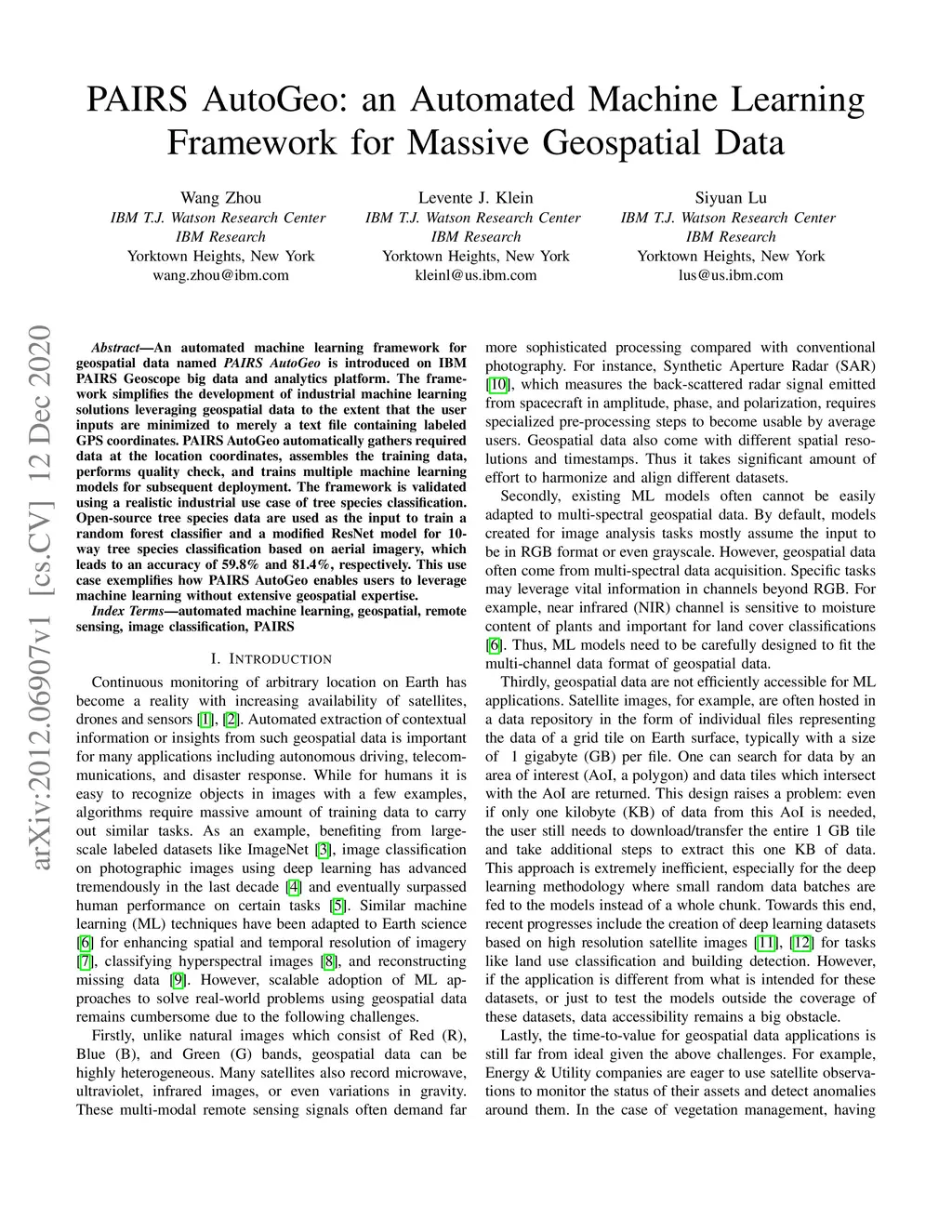 An automated machine learning framework for geospatial data named PAIRS AutoGeo is introduced on IBM PAIRS Geoscope big data and analytics platform. The framework simplifies the development of industrial machine learning solutions leveraging geospatial data to the extent that the user inputs are minimized to merely a text file containing labeled GPS coordinates. PAIRS AutoGeo automatically gathers required data at the location coordinates, assembles the training data, performs quality check, and trains multiple machine learning models for subsequent deployment. The framework is validated using a realistic industrial use case of tree species classification. Open-source tree species data are used as the input to train a random forest classifier and a modified ResNet model for 10-way tree species classification based on aerial imagery, which leads to an accuracy of and , respectively. This use case exemplifies how PAIRS AutoGeo enables users to leverage machine learning without extensive geospatial expertise.