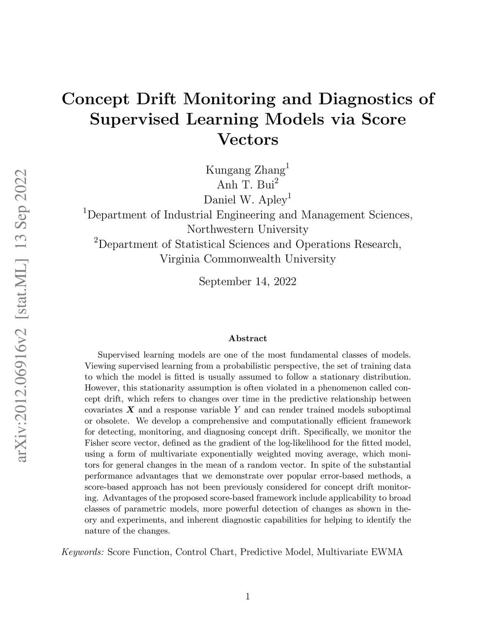Supervised learning models are one of the most fundamental classes of models. Viewing supervised learning from a probabilistic perspective, the set of training data to which the model is fitted is usually assumed to follow a stationary distribution. However, this stationarity assumption is often violated in a phenomenon called concept drift, which refers to changes over time in the predictive relationship between covariates and a response variable and can render trained models suboptimal or obsolete. We develop a comprehensive and computationally efficient framework for detecting, monitoring, and diagnosing concept drift. Specifically, we monitor the Fisher score vector, defined as the gradient of the log-likelihood for the fitted model, using a form of multivariate exponentially weighted moving average, which monitors for general changes in the mean of a random vector. In spite of the substantial performance advantages that we demonstrate over popular error-based methods, a score-based approach has not been previously considered for concept drift monitoring. Advantages of the proposed score-based framework include applicability to any parametric model, more powerful detection of changes as shown in theory and experiments, and inherent diagnostic capabilities for helping to identify the nature of the changes.