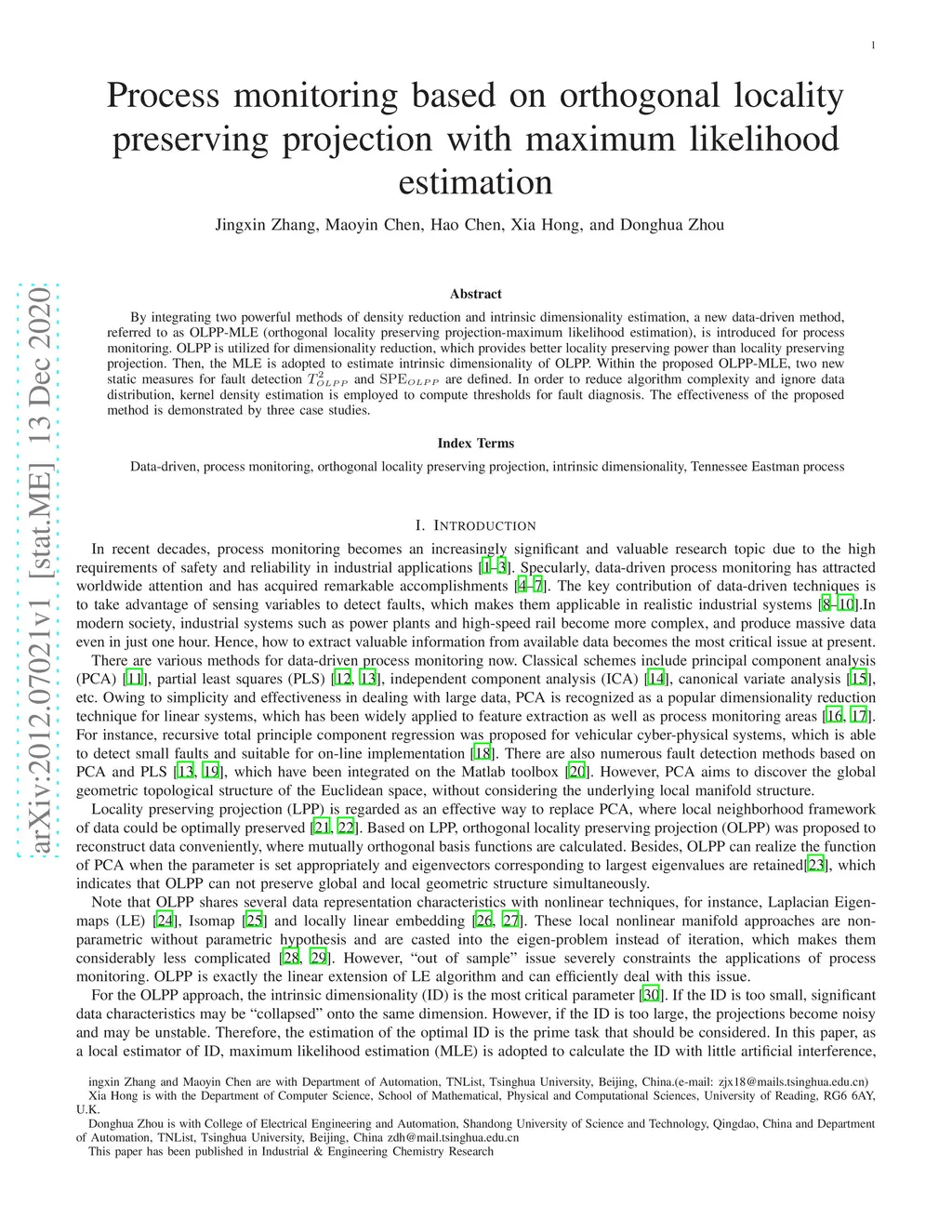 By integrating two powerful methods of density reduction and intrinsic dimensionality estimation, a new data-driven method, referred to as OLPP-MLE (orthogonal locality preserving projection-maximum likelihood estimation), is introduced for process monitoring. OLPP is utilized for dimensionality reduction, which provides better locality preserving power than locality preserving projection. Then, the MLE is adopted to estimate intrinsic dimensionality of OLPP. Within the proposed OLPP-MLE, two new static measures for fault detection and are defined. In order to reduce algorithm complexity and ignore data distribution, kernel density estimation is employed to compute thresholds for fault diagnosis. The effectiveness of the proposed method is demonstrated by three case studies.