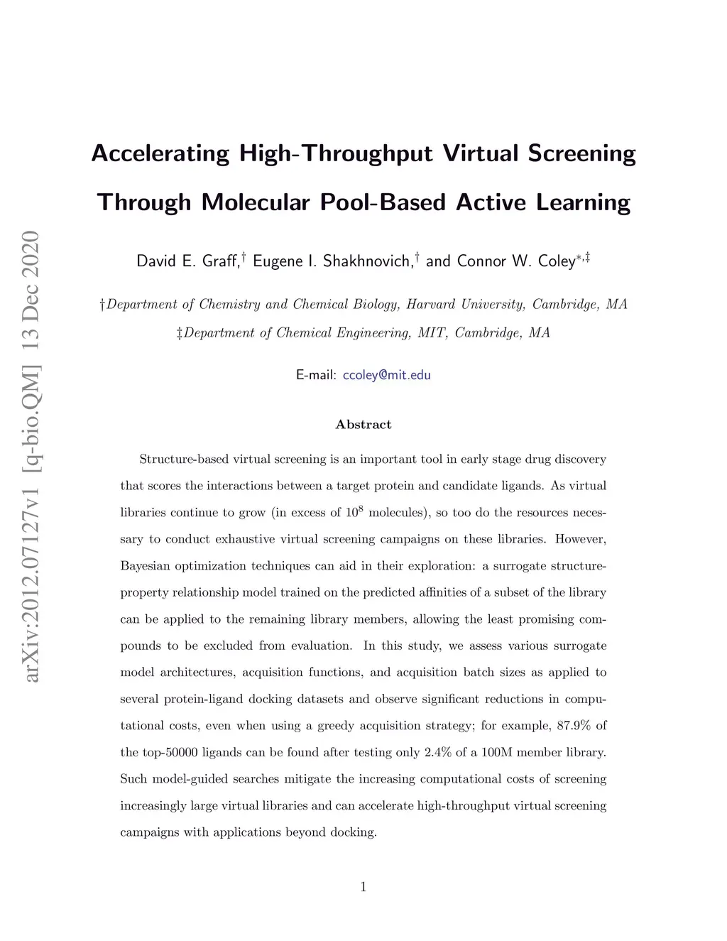 Structure-based virtual screening is an important tool in early stage drug discovery that scores the interactions between a target protein and candidate ligands. As virtual libraries continue to grow (in excess of molecules), so too do the resources necessary to conduct exhaustive virtual screening campaigns on these libraries. However, Bayesian optimization techniques can aid in their exploration: a surrogate structure-property relationship model trained on the predicted affinities of a subset of the library can be applied to the remaining library members, allowing the least promising compounds to be excluded from evaluation. In this study, we assess various surrogate model architectures, acquisition functions, and acquisition batch sizes as applied to several protein-ligand docking datasets and observe significant reductions in computational costs, even when using a greedy acquisition strategy; for example, 87.9% of the top-50000 ligands can be found after testing only 2.4% of a 100M member library. Such model-guided searches mitigate the increasing computational costs of screening increasingly large virtual libraries and can accelerate high-throughput virtual screening campaigns with applications beyond docking.