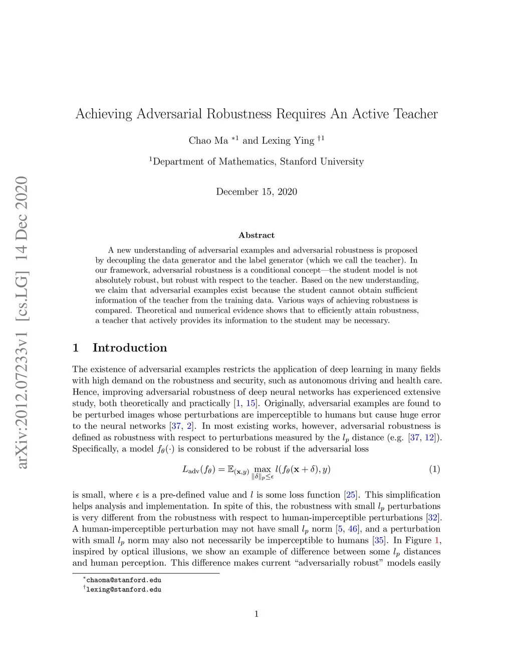 A new understanding of adversarial examples and adversarial robustness is proposed by decoupling the data generator and the label generator (which we call the teacher). In our framework, adversarial robustness is a conditional concept---the student model is not absolutely robust, but robust with respect to the teacher. Based on the new understanding, we claim that adversarial examples exist because the student cannot obtain sufficient information of the teacher from the training data. Various ways of achieving robustness is compared. Theoretical and numerical evidence shows that to efficiently attain robustness, a teacher that actively provides its information to the student may be necessary.