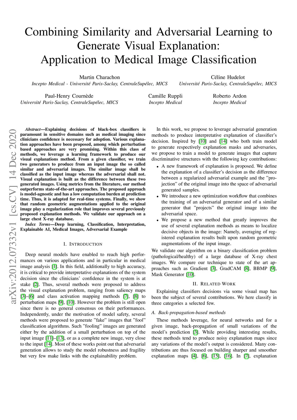 Explaining decisions of black-box classifiers is paramount in sensitive domains such as medical imaging since clinicians confidence is necessary for adoption. Various explanation approaches have been proposed, among which perturbation based approaches are very promising. Within this class of methods, we leverage a learning framework to produce our visual explanations method. From a given classifier, we train two generators to produce from an input image the so called similar and adversarial images. The similar image shall be classified as the input image whereas the adversarial shall not. Visual explanation is built as the difference between these two generated images. Using metrics from the literature, our method outperforms state-of-the-art approaches. The proposed approach is model-agnostic and has a low computation burden at prediction time. Thus, it is adapted for real-time systems. Finally, we show that random geometric augmentations applied to the original image play a regularization role that improves several previously proposed explanation methods. We validate our approach on a large chest X-ray database.