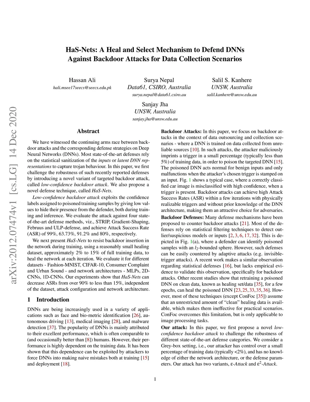 We have witnessed the continuing arms race between backdoor attacks and the corresponding defense strategies on Deep Neural Networks (DNNs). Most state-of-the-art defenses rely on the statistical sanitization of the "inputs" or "latent DNN representations" to capture trojan behaviour. In this paper, we first challenge the robustness of such recently reported defenses by introducing a novel variant of targeted backdoor attack, called "low-confidence backdoor attack". We also propose a novel defense technique, called "HaS-Nets". "Low-confidence backdoor attack" exploits the confidence labels assigned to poisoned training samples by giving low values to hide their presence from the defender, both during training and inference. We evaluate the attack against four state-of-the-art defense methods, viz., STRIP, Gradient-Shaping, Februus and ULP-defense, and achieve Attack Success Rate (ASR) of 99%, 63.73%, 91.2% and 80%, respectively. We next present "HaS-Nets" to resist backdoor insertion in the network during training, using a reasonably small healing dataset, approximately 2% to 15% of full training data, to heal the network at each iteration. We evaluate it for different datasets - Fashion-MNIST, CIFAR-10, Consumer Complaint and Urban Sound - and network architectures - MLPs, 2D-CNNs, 1D-CNNs. Our experiments show that "HaS-Nets" can decrease ASRs from over 90% to less than 15%, independent of the dataset, attack configuration and network architecture.