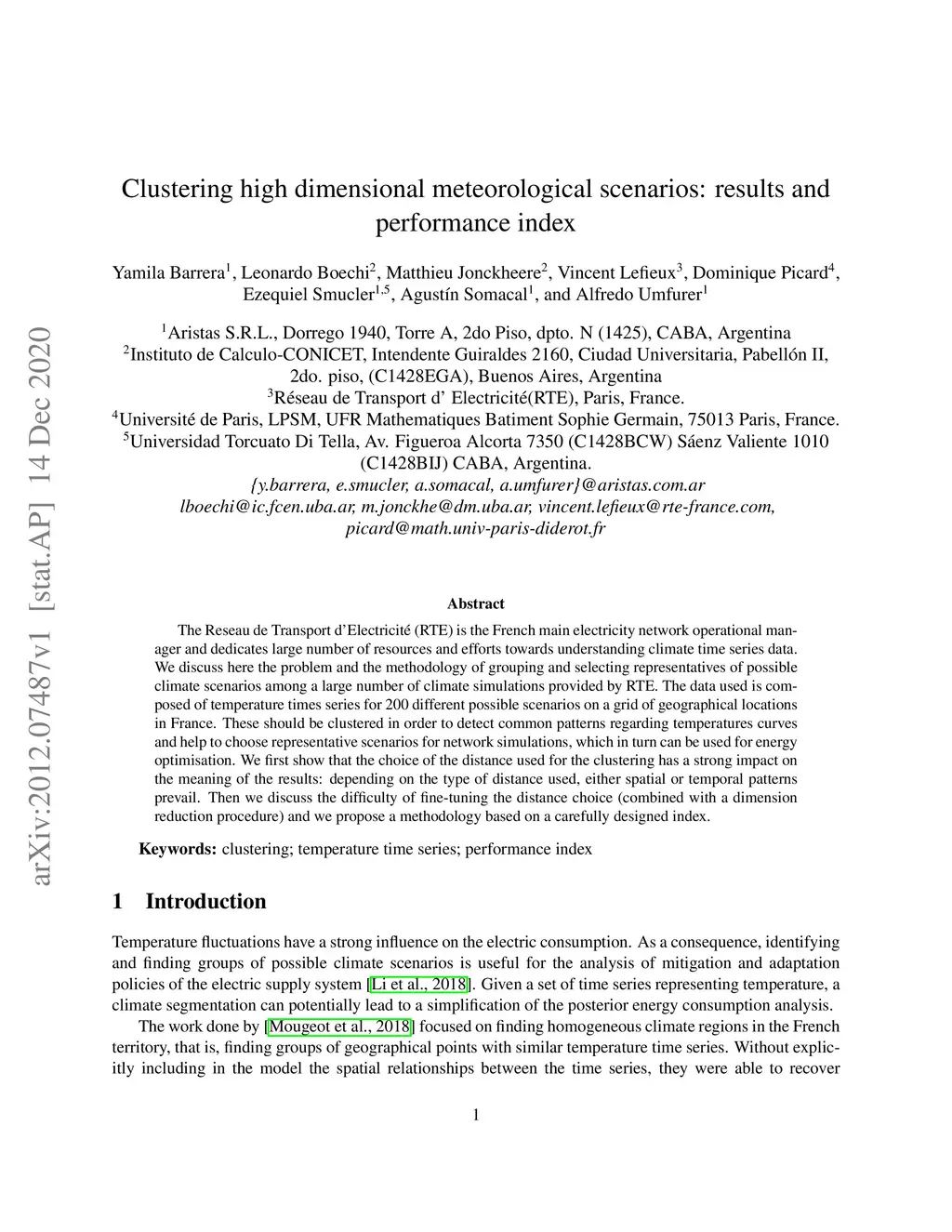 The Reseau de Transport dÉlectricit\é (RTE) is the French main electricity network operational manager and dedicates large number of resources and efforts towards understanding climate time series data. We discuss here the problem and the methodology of grouping and selecting representatives of possible climate scenarios among a large number of climate simulations provided by RTE. The data used is composed of temperature times series for 200 different possible scenarios on a grid of geographical locations in France. These should be clustered in order to detect common patterns regarding temperatures curves and help to choose representative scenarios for network simulations, which in turn can be used for energy optimisation. We first show that the choice of the distance used for the clustering has a strong impact on the meaning of the results: depending on the type of distance used, either spatial or temporal patterns prevail. Then we discuss the difficulty of fine-tuning the distance choice (combined with a dimension reduction procedure) and we propose a methodology based on a carefully designed index.
