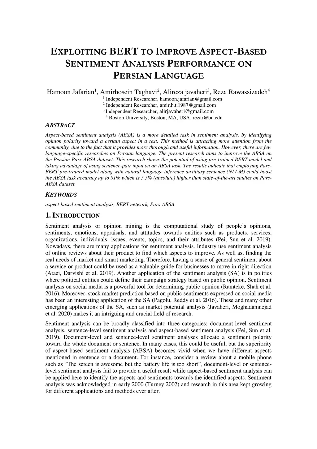 Aspect-based sentiment analysis (ABSA) is a more detailed task in sentiment analysis, by identifying opinion polarity toward a certain aspect in a text. This method is attracting more attention from the community, due to the fact that it provides more thorough and useful information. However, there are few language-specific researches on Persian language. The present research aims to improve the ABSA on the Persian Pars-ABSA dataset. This research shows the potential of using pre-trained BERT model and taking advantage of using sentence-pair input on an ABSA task. The results indicate that employing Pars-BERT pre-trained model along with natural language inference auxiliary sentence (NLI-M) could boost the ABSA task accuracy up to 91% which is 5.5% (absolute) higher than state-of-the-art studies on Pars-ABSA dataset.