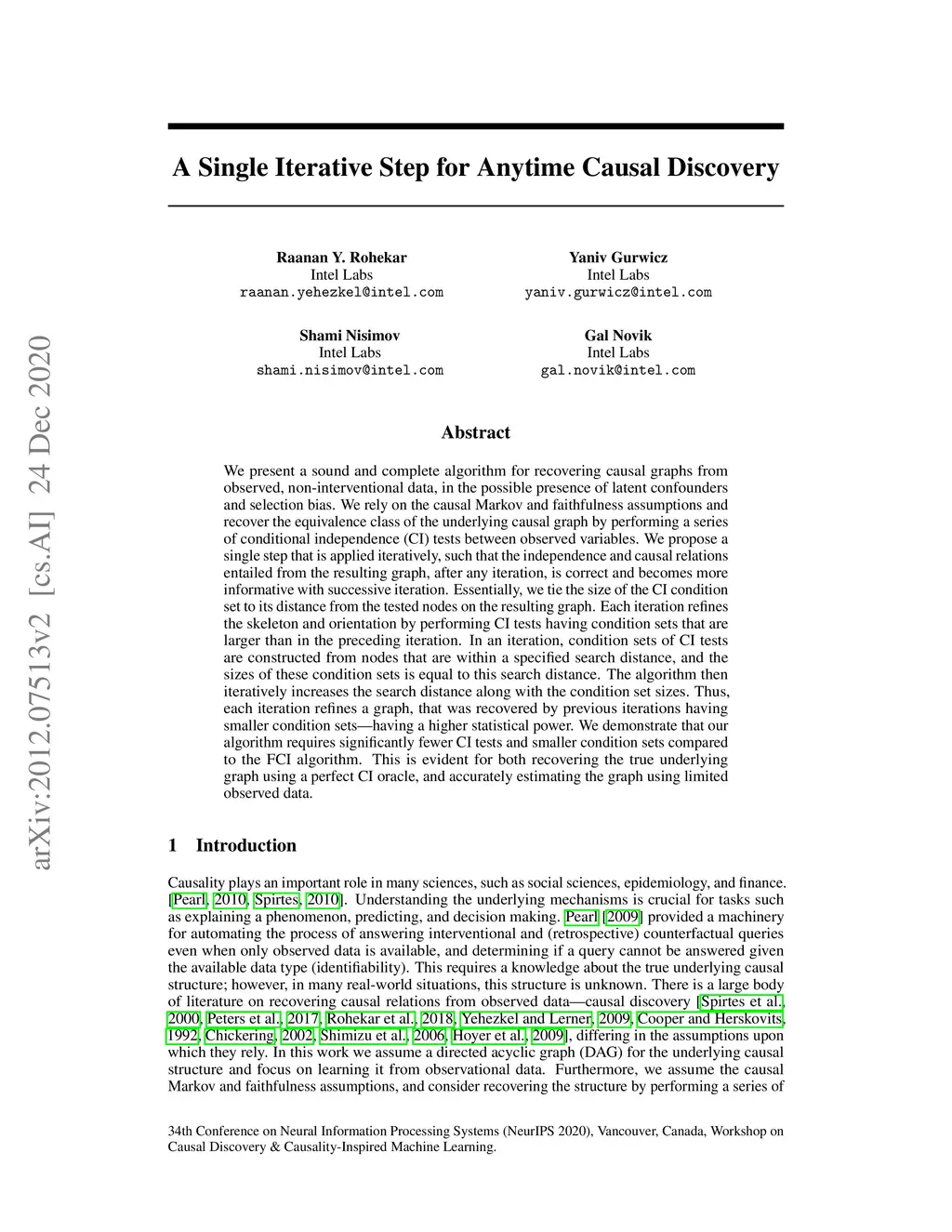 We present a sound and complete algorithm for recovering causal graphs from observed, non-interventional data, in the possible presence of latent confounders and selection bias. We rely on the causal Markov and faithfulness assumptions and recover the equivalence class of the underlying causal graph by performing a series of conditional independence (CI) tests between observed variables. We propose a single step that is applied iteratively, such that the independence and causal relations entailed from the resulting graph, after any iteration, is correct and becomes more informative with successive iteration. Essentially, we tie the size of the CI condition set to its distance from the tested nodes on the resulting graph. Each iteration refines the skeleton and orientation by performing CI tests having condition sets that are larger than in the preceding iteration. In an iteration, condition sets of CI tests are constructed from nodes that are within a specified search distance, and the sizes of these condition sets is equal to this search distance. The algorithm then iteratively increases the search distance along with the condition set sizes. Thus, each iteration refines a graph, that was recovered by previous iterations having smaller condition sets---having a higher statistical power. We demonstrate that our algorithm requires significantly fewer CI tests and smaller condition sets compared to the FCI algorithm. This is evident for both recovering the true underlying graph using a perfect CI oracle, and accurately estimating the graph using limited observed data.